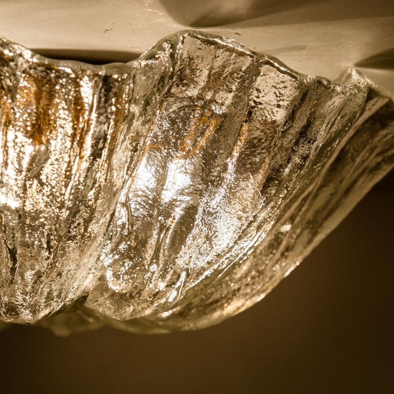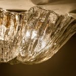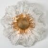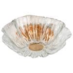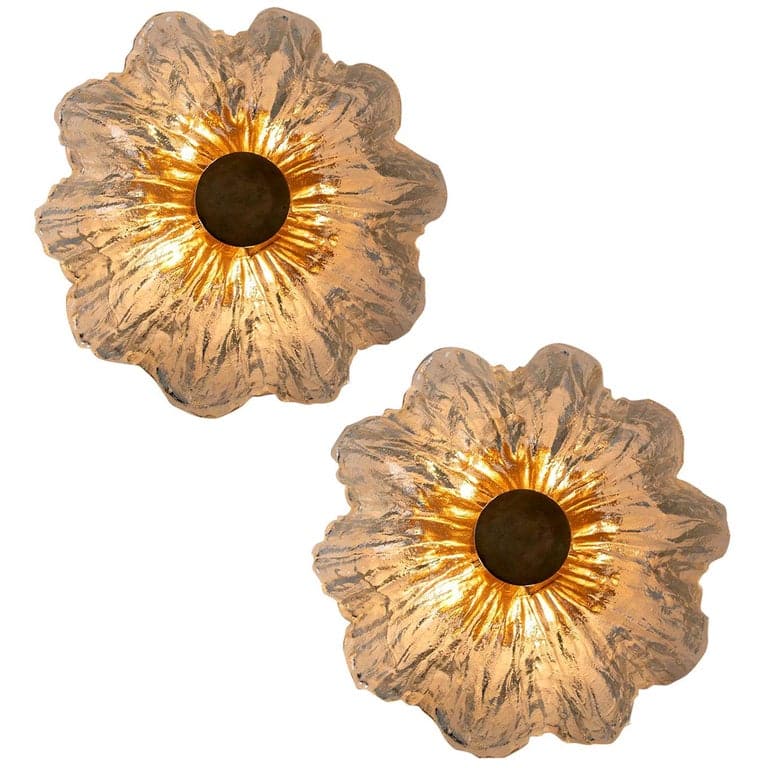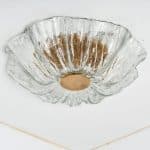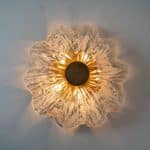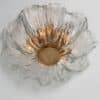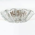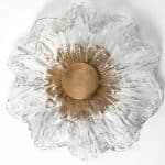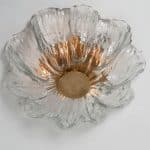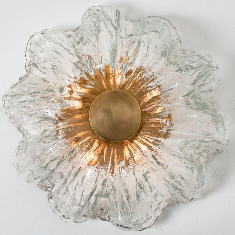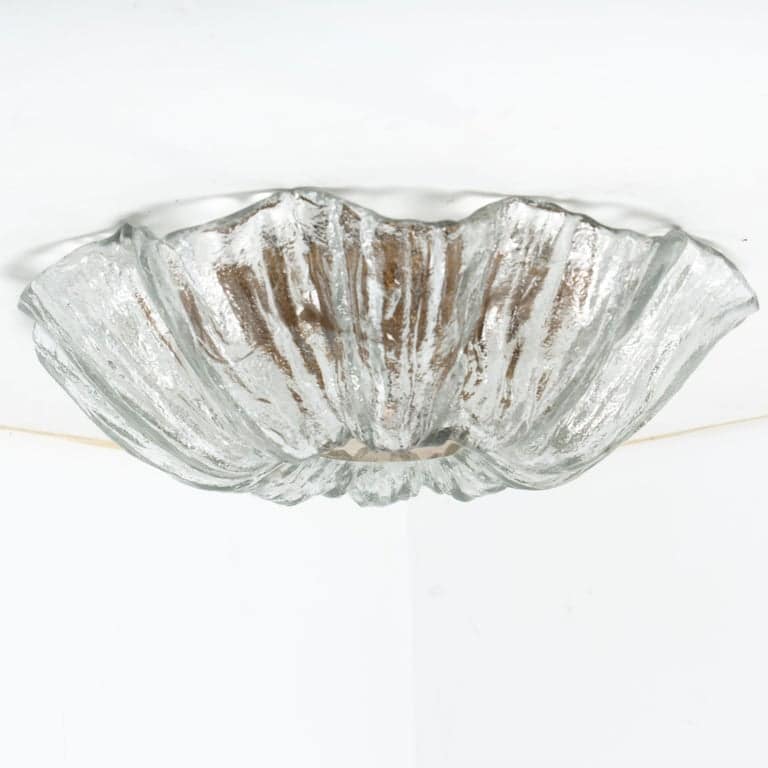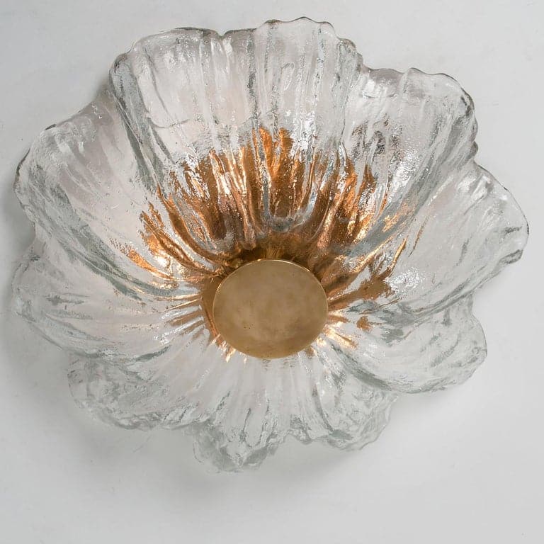 This flush mounts are featuring a huge round hand blown flower glass dish giving the piece a heavy ice appearance which refracts the light, filling a room with a soft, warm glow. Beautiful craftsmanship. Can also work for impressive wall lights.xa0