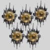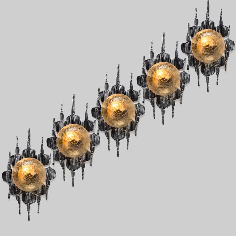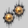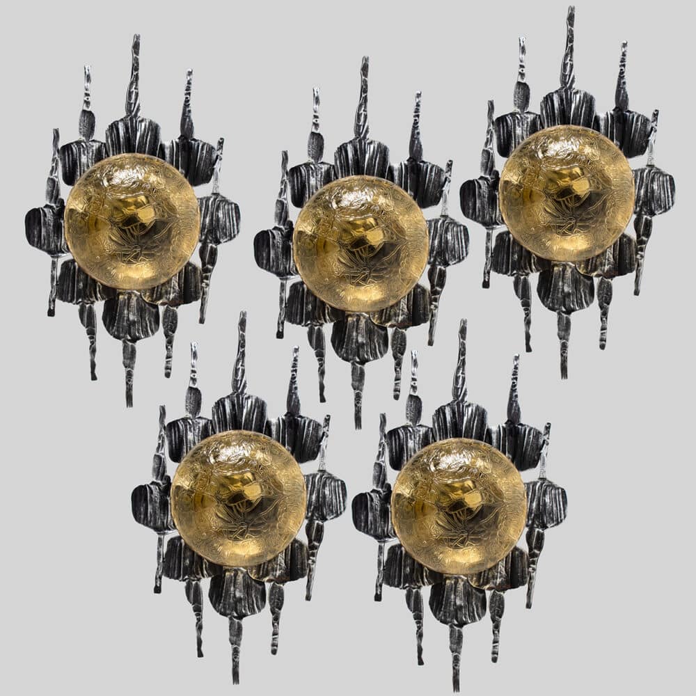 1 of 5 beautiful gray and yellow iron flush mounts. Manufactured in Denmark during the 1960s. Original and well kept. Each flush mount composed of large acid treated plates welded together, with a yellow bulb in the middle.