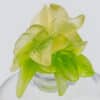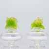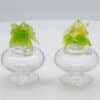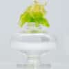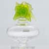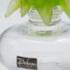 The bottle – made out of art glass – is made from a clear glass, with a green colored glass flower on top. Beautiful artwork.