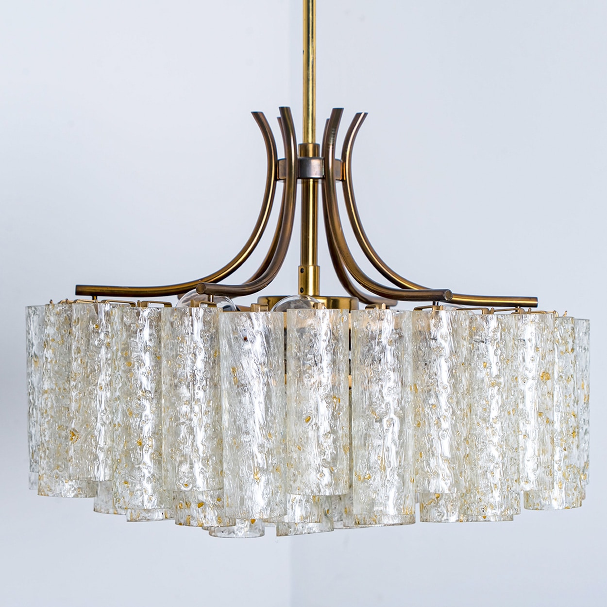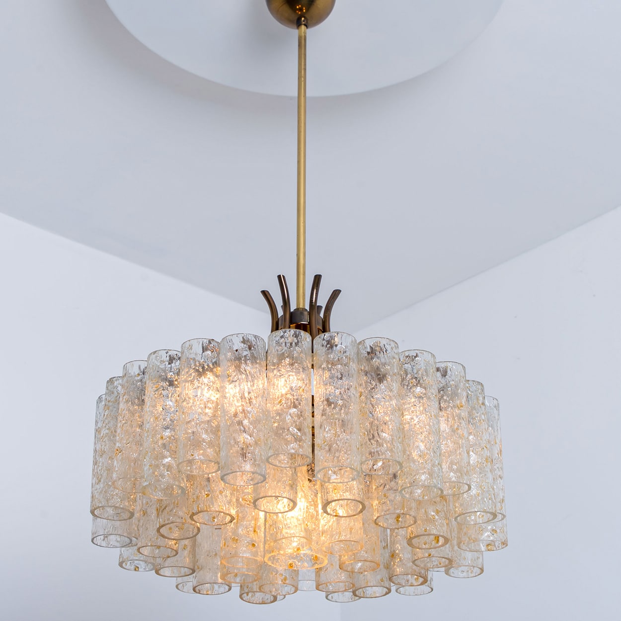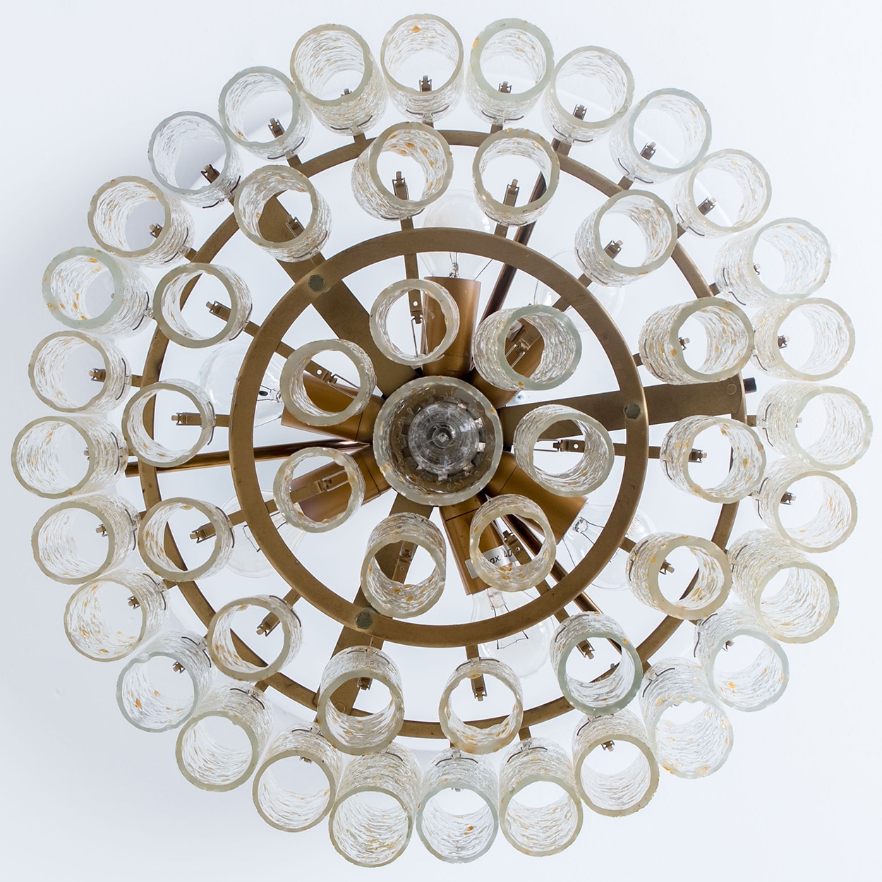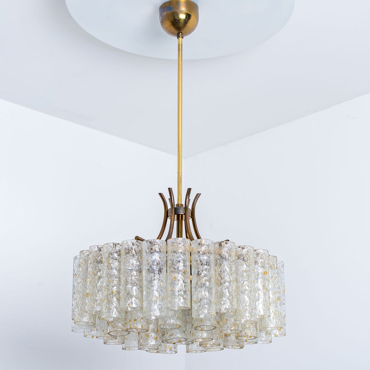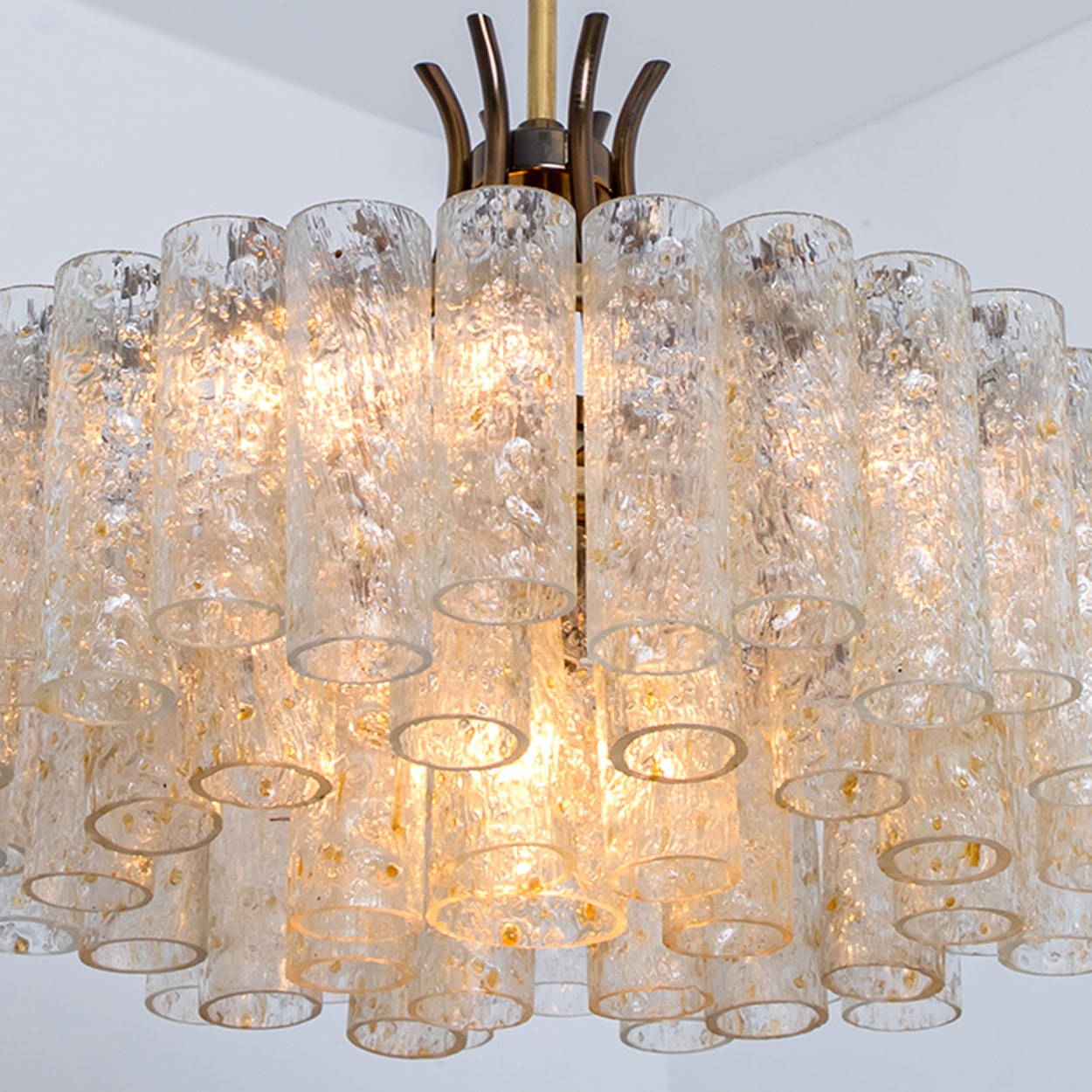 Mid-century modern chandelier produced by Doria Leuchten in Germany in the 1960s. The lamp features a brass frame with 50 Murano glass tubes with gold flakes hanging from it.
