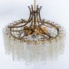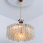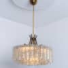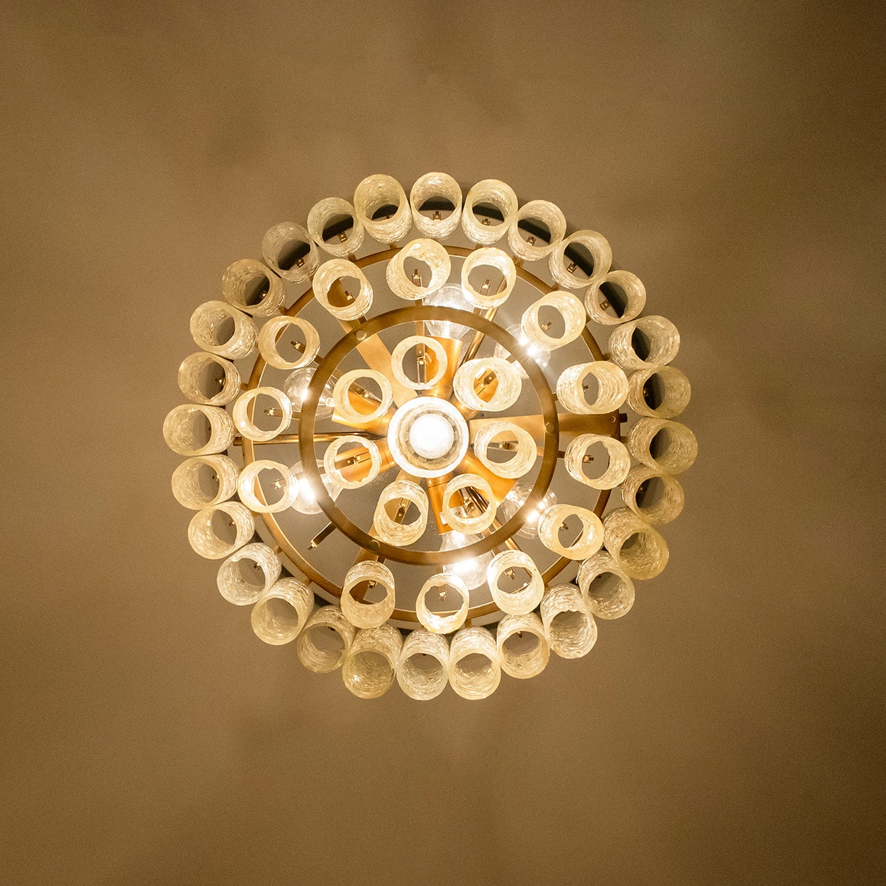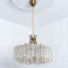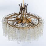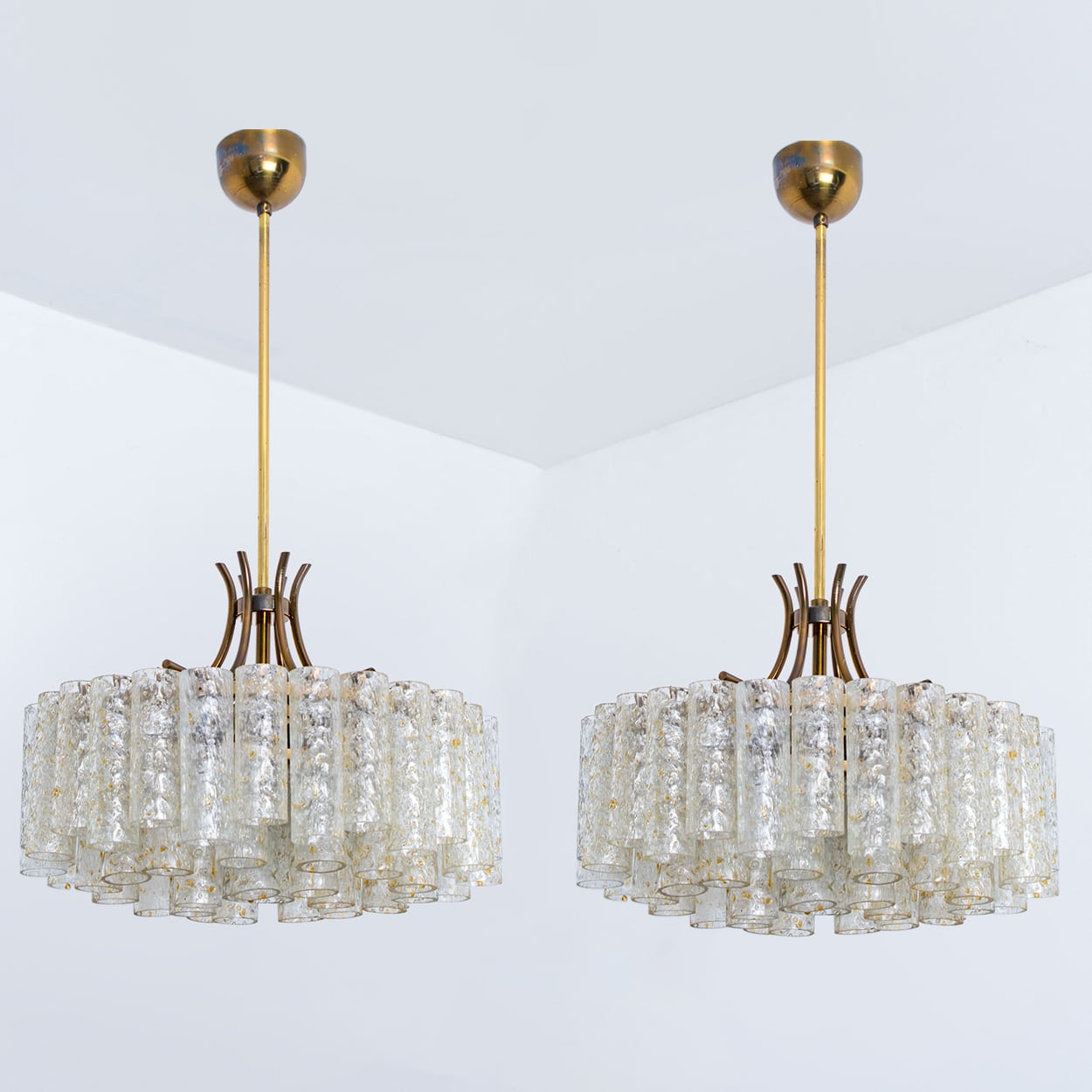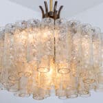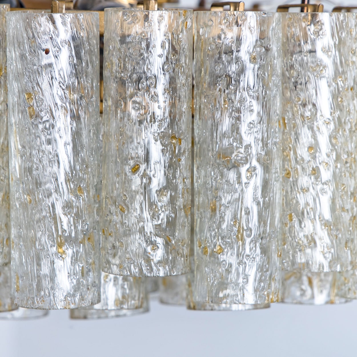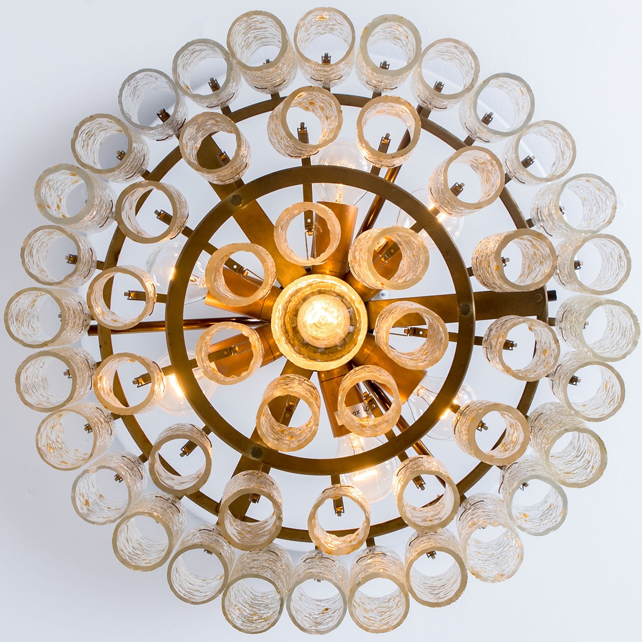 Mid-century modern chandelier produced by Doria Leuchten in Germany in the 1960s. The lamp features a brass frame with 50 Murano glass tubes with gold flakes hanging from it.