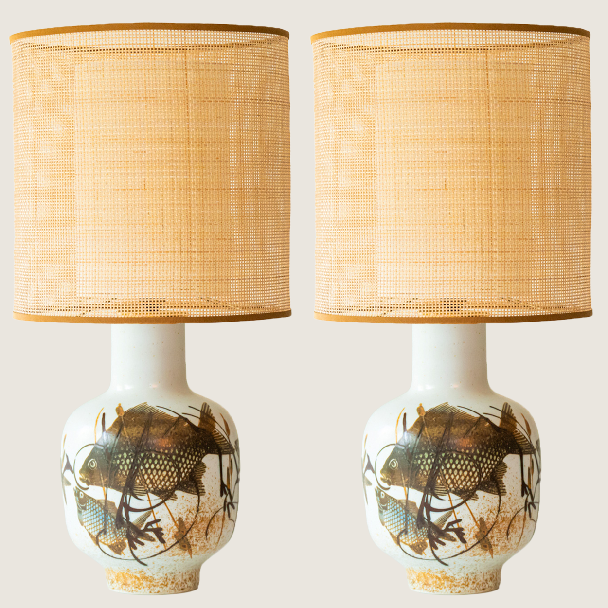 This beige base with a fish motif on it fits perfectly with the custom made rattan shade, with beige inner shade and brown trimming.