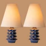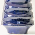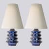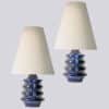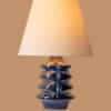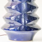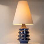 This base with blue colored ceramics and a geometrical shape fits perfectly with the custom made conical lamp shade.