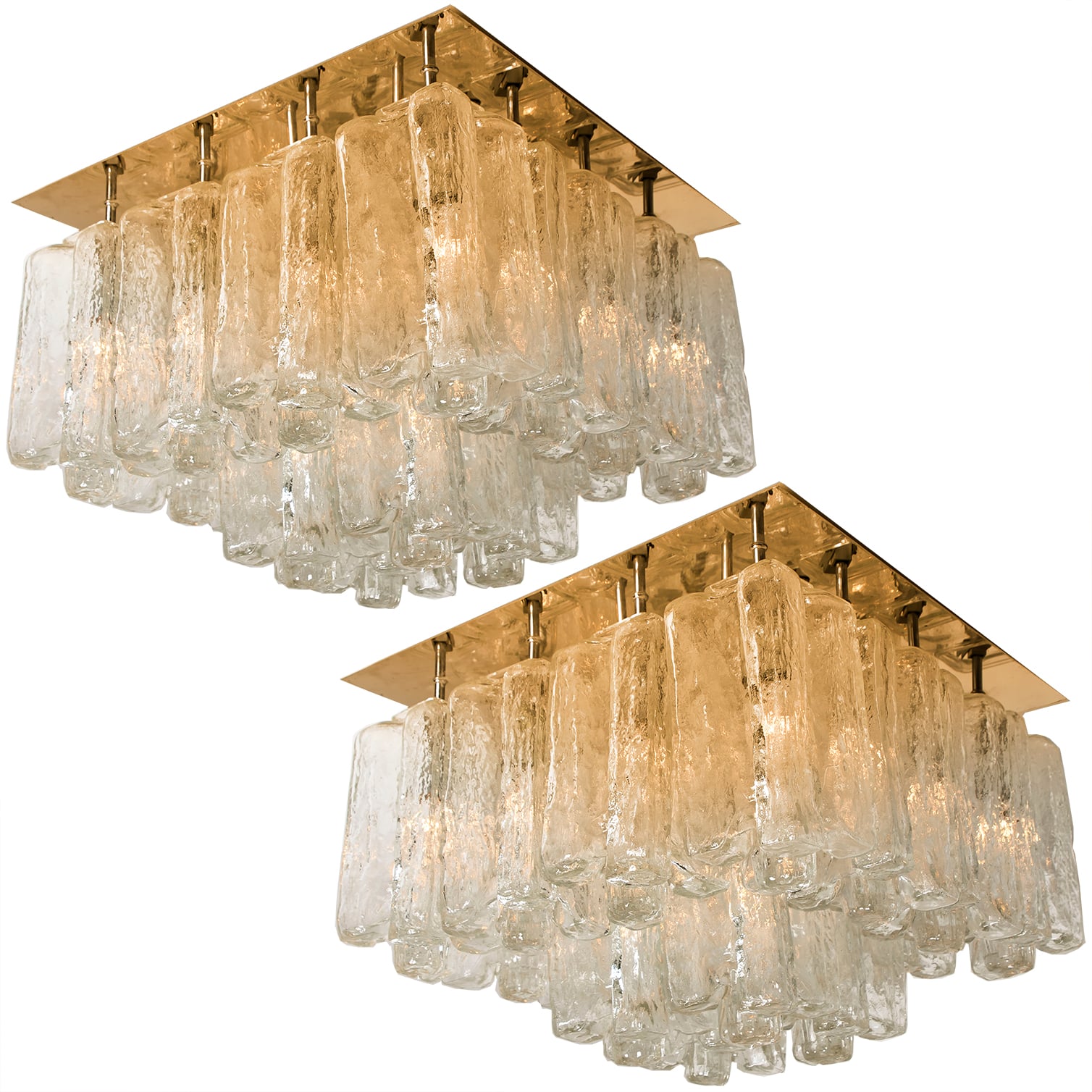 1 of the 2 flush lights with Brutalist ice glass on a brass frame, circa 1970s, by J.T. Kalmar. Cruciform design flush mount light with structured glass shade and a central brass square column.