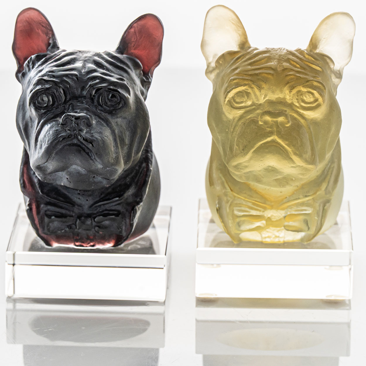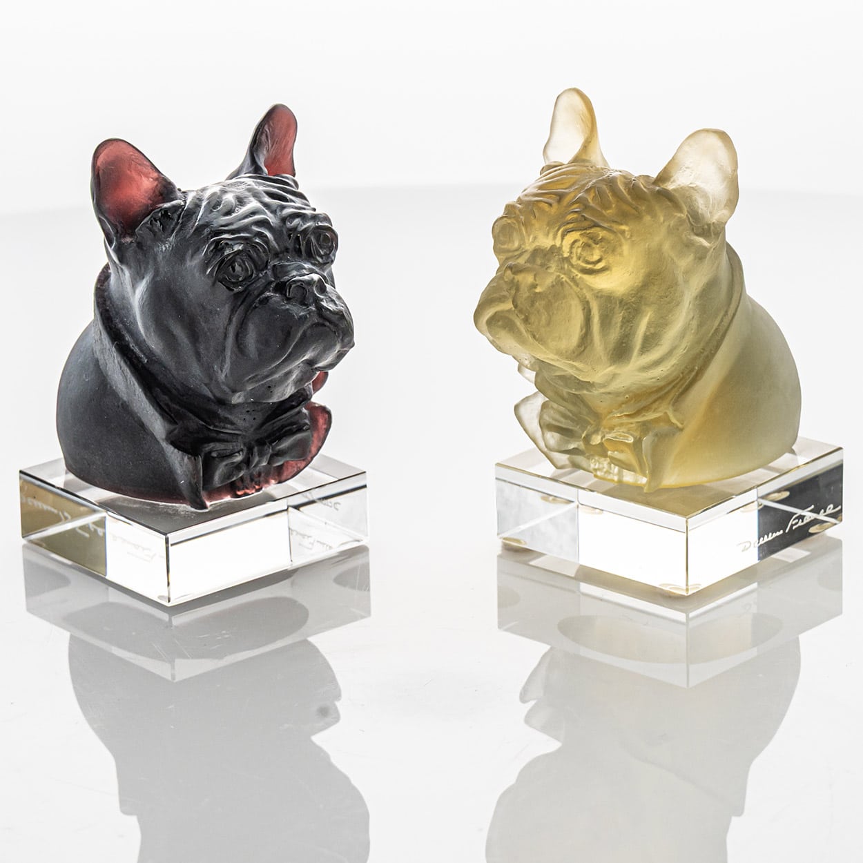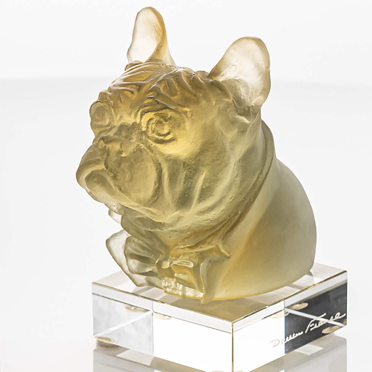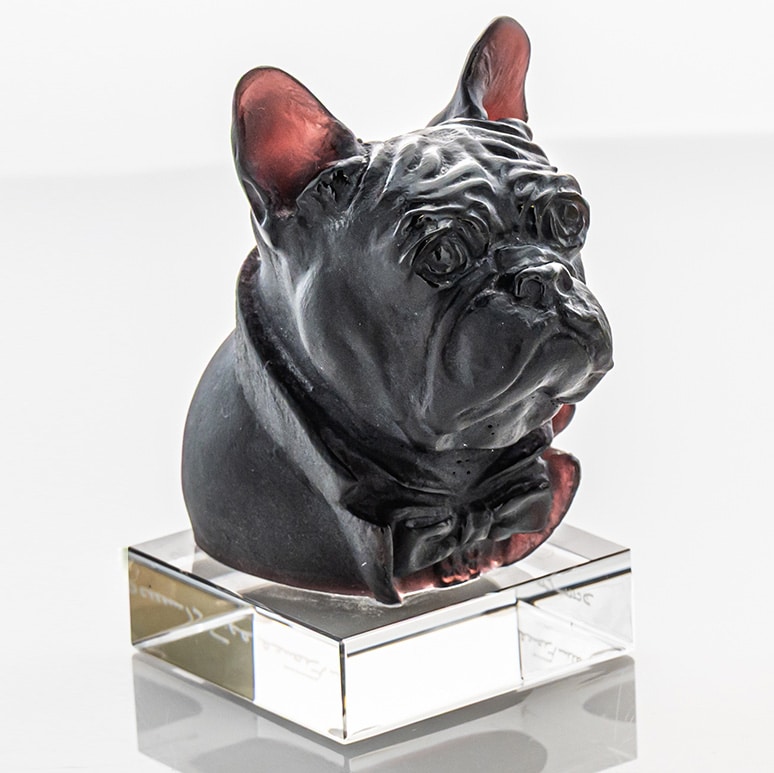 The sculptures in the image are bulldogs created by Daum Frères in the late 20th century, around 1980. It was produced by the renowned French glassmaker Daum, known for its mastery of the pâte de verre technique — a process in which finely ground glass is melted within a mold to achieve delicate textures and rich colors. While Daum Frères first gained fame during the Art Nouveau period for their intricate glass engravings, the company later revived and perfected the pâte de verre method, creating contemporary pieces.