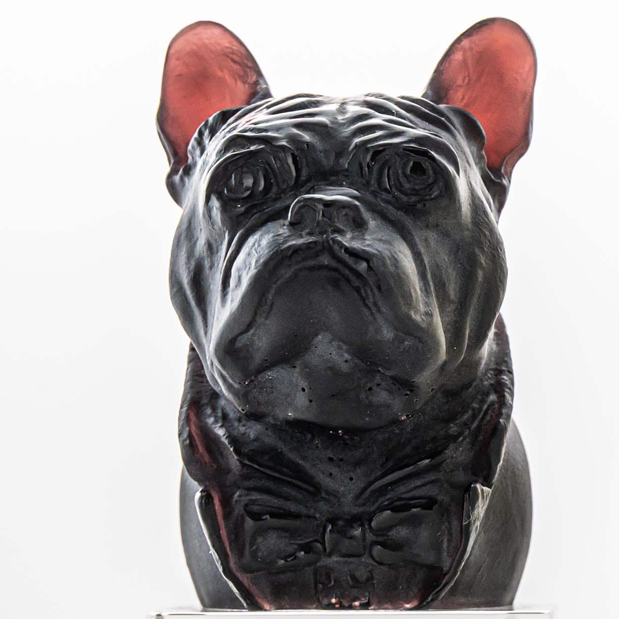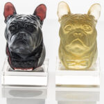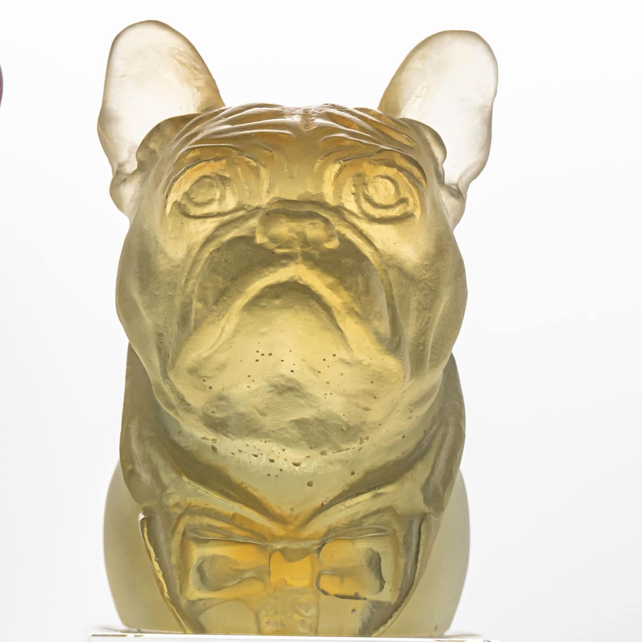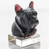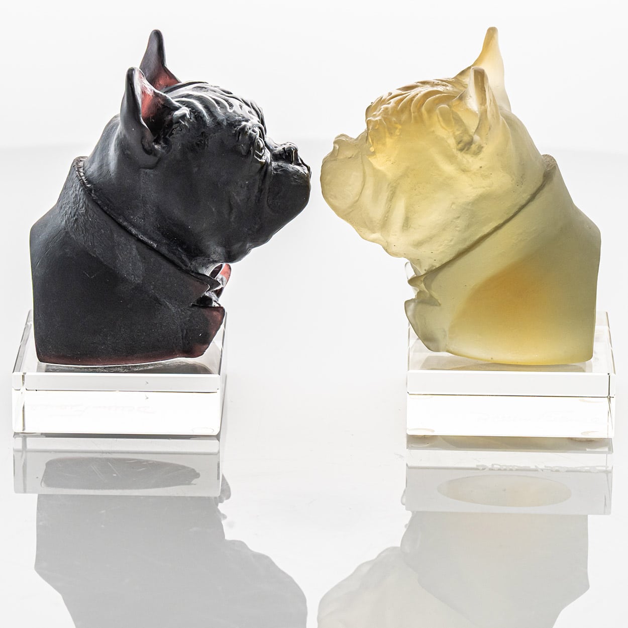 The sculptures in the image are bulldogs created by Daum Frères in the late 20th century, around 1980. It was produced by the renowned French glassmaker Daum, known for its mastery of the pâte de verre technique — a process in which finely ground glass is melted within a mold to achieve delicate textures and rich colors. While Daum Frères first gained fame during the Art Nouveau period for their intricate glass engravings, the company later revived and perfected the pâte de verre method, creating contemporary pieces.