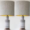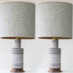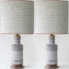 The gray ceramics and the wooden base fit perfectly with the custom made gray silk lampshade with brown trimming and bronze innershade, illuminates beautifully.