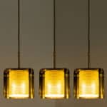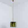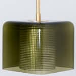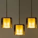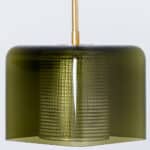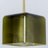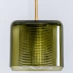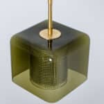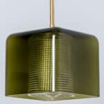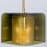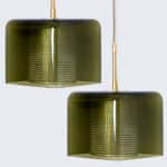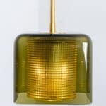These green scandinavian glass pendant lamps were produced in the 1960s by the iconic firm of Orrefors and designed by Carl Fagerlund. The outer glass has a light green hue, the inner glass is clear, and it features a stunning engraving that creates beautiful lighting within the interior.
