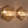 One of the six Venini style glass sconces with triedi crystals, manufactured in circa 1970 (late 1960s and early 1970s) featuring 9 crystal clear glass “triete” prism-rods, each engirdled within a hexagonal brass structure. Illuminates beautifully.