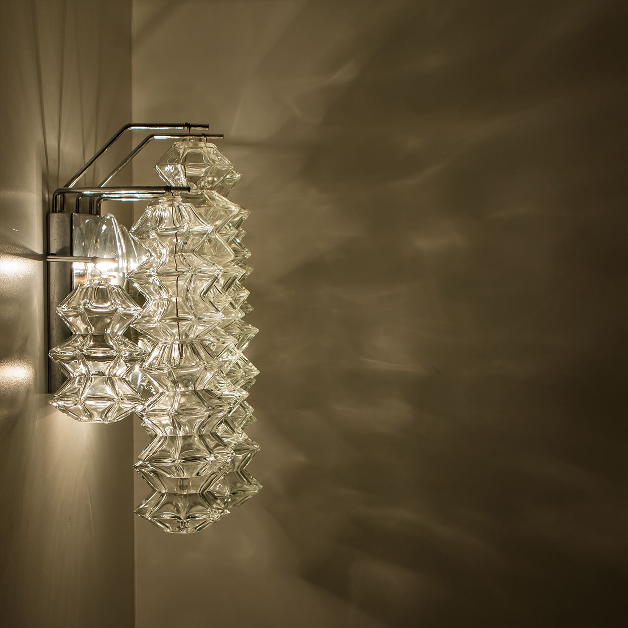 Mid Century Modern vintage glass chrome Pagoda sconces by Kalmar, circa 1969, Austria Vienna.