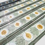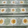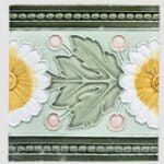 A beautiful relief and deep green and yellow colors with lightgreen background with pink details. These tiles would be charming displayed on easels, framed or incorporated into a custom tile design.