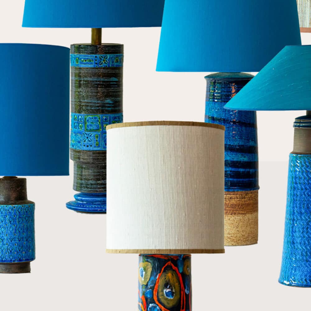 The bases with various blue and dark brown/black tones fit perfectly with the custom made neutral lamp shades, with white inner shades.