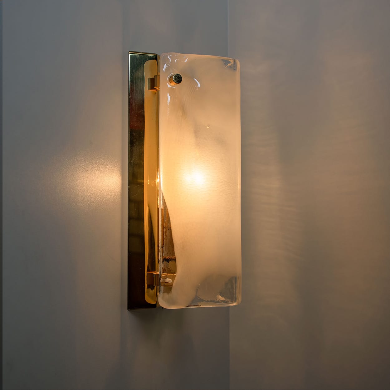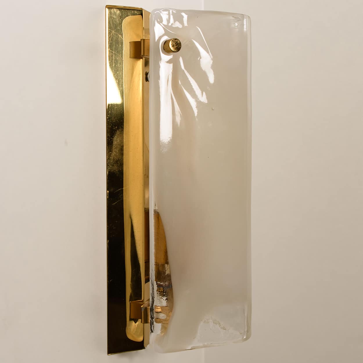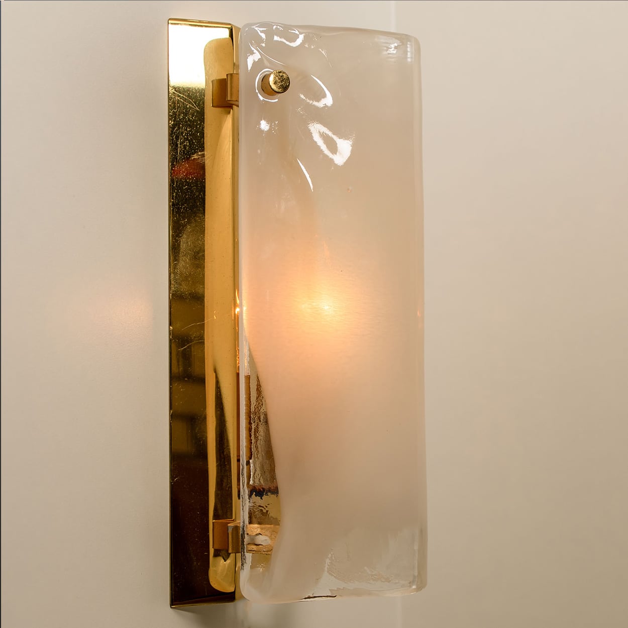 Pair of high-end wall sconces made of blown opal and clear glass on a brass hardware. Designed and produced by J.T. Kalmar, Austria in the 1960s. Minimalistic design executed with a taste for excellence in craftsmanship. These are real statement pieces.