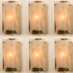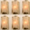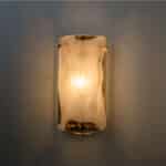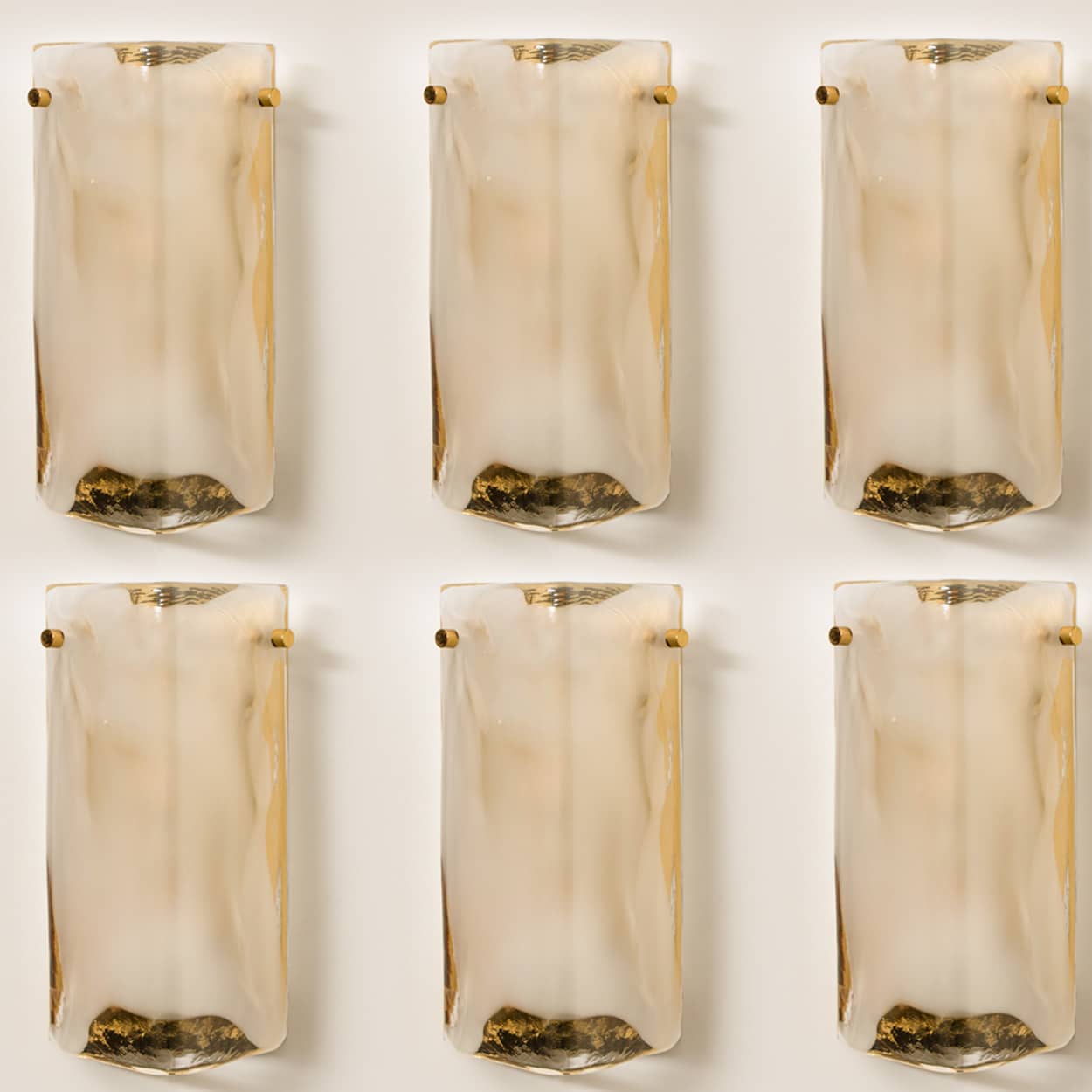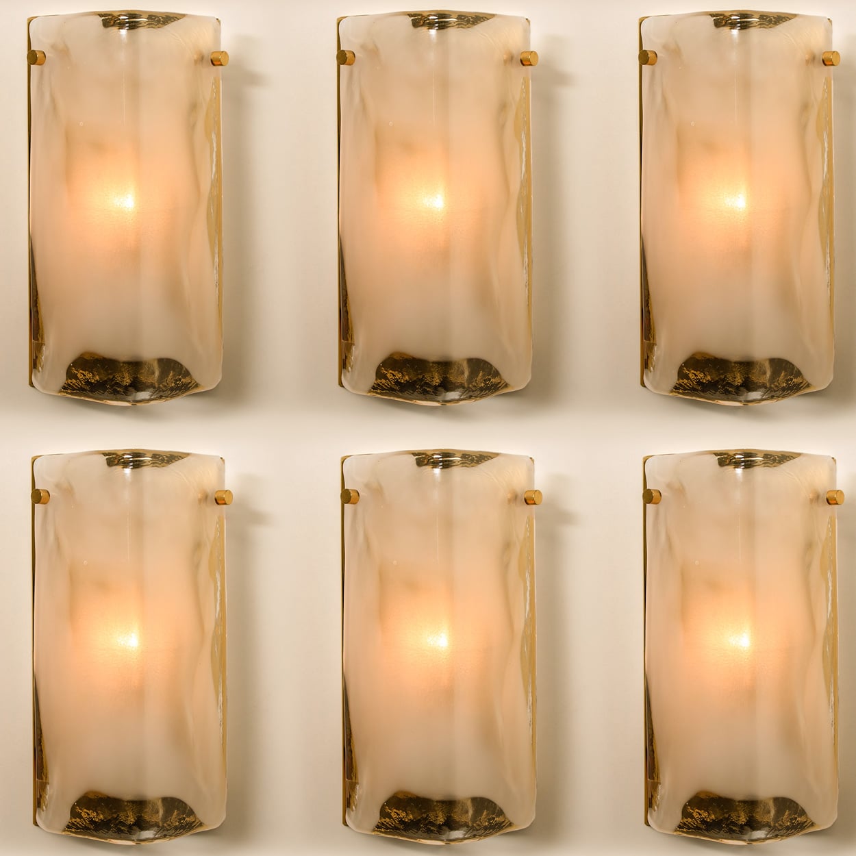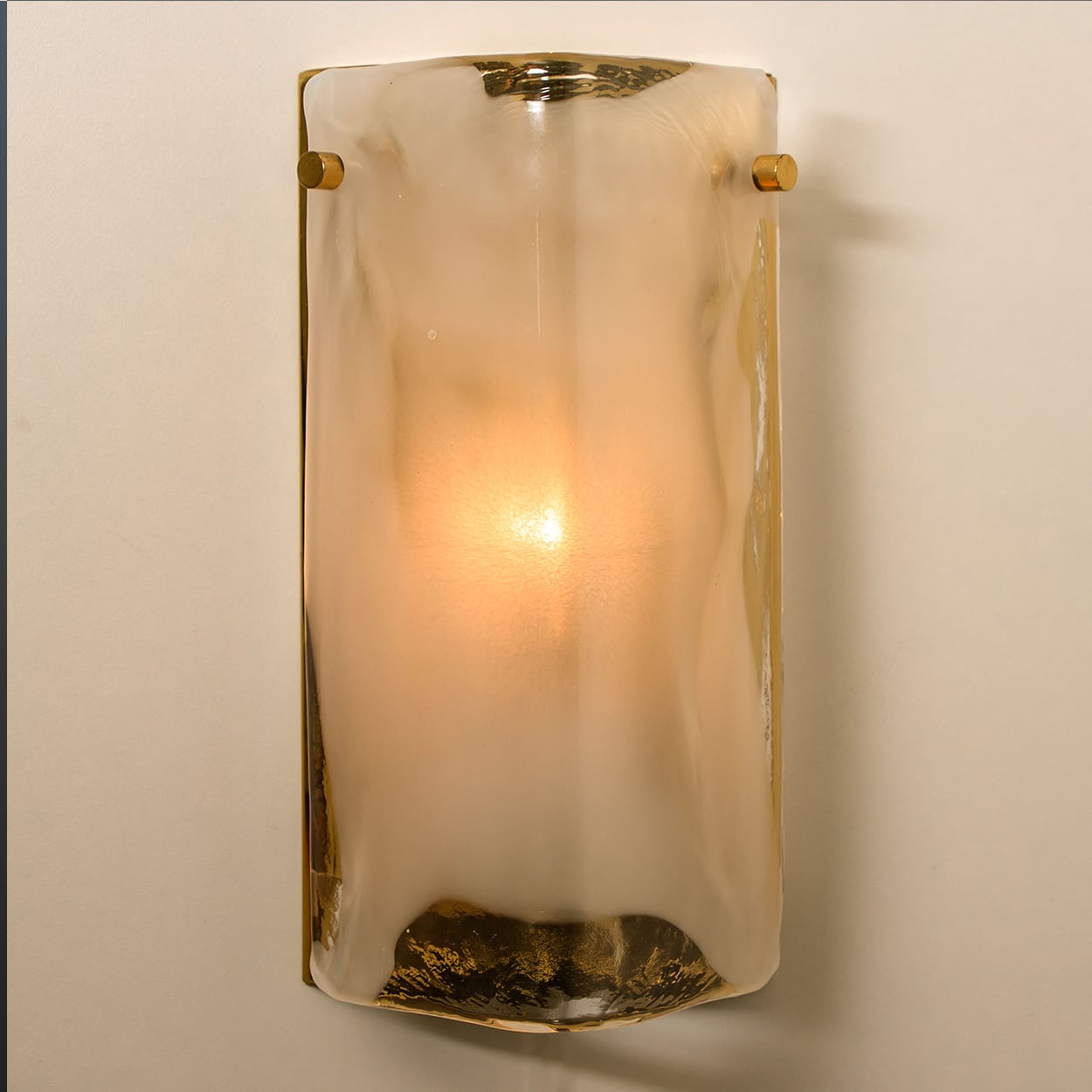 Pair of high-end wall sconces made of blown opal and clear glass on a brass hardware. Designed and produced by J.T. Kalmar, Austria in the 1960s. Minimalistic design executed with a taste for excellence in craftsmanship. These are real statement pieces.