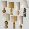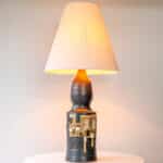 1 of the 7 beautiful ceramic table/ floor lamps by Georges Pelletier, 2022. Custom made silk and rattan lampshades by René Houben.