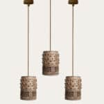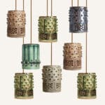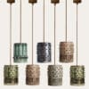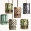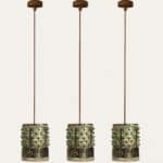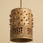 One of the eight stunning round ceramic hanging lamps with a beautiful pattern, made with rich colored ceramics, manufactured by Jette Hellerøe for Axella in the 1960s in Denmark.
