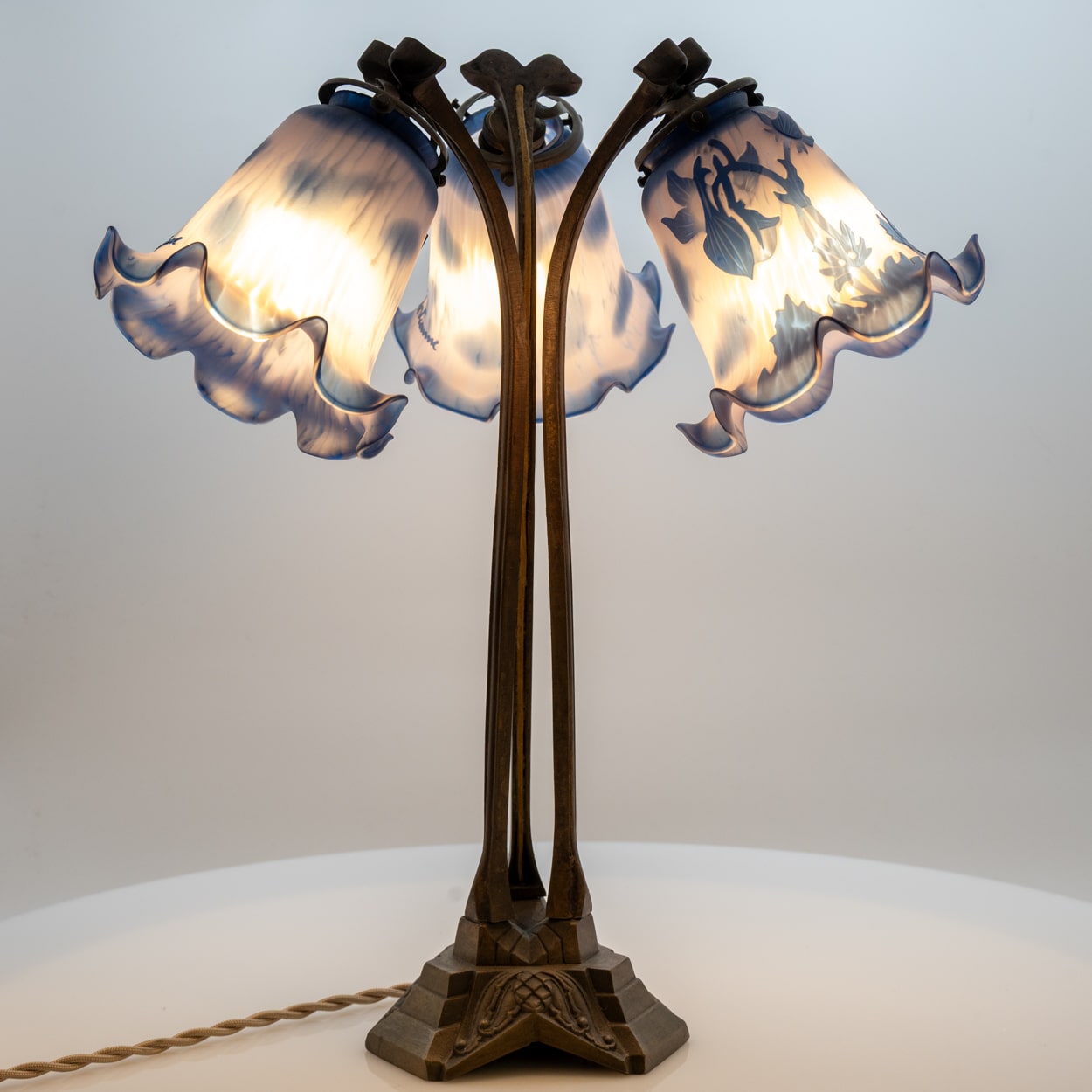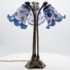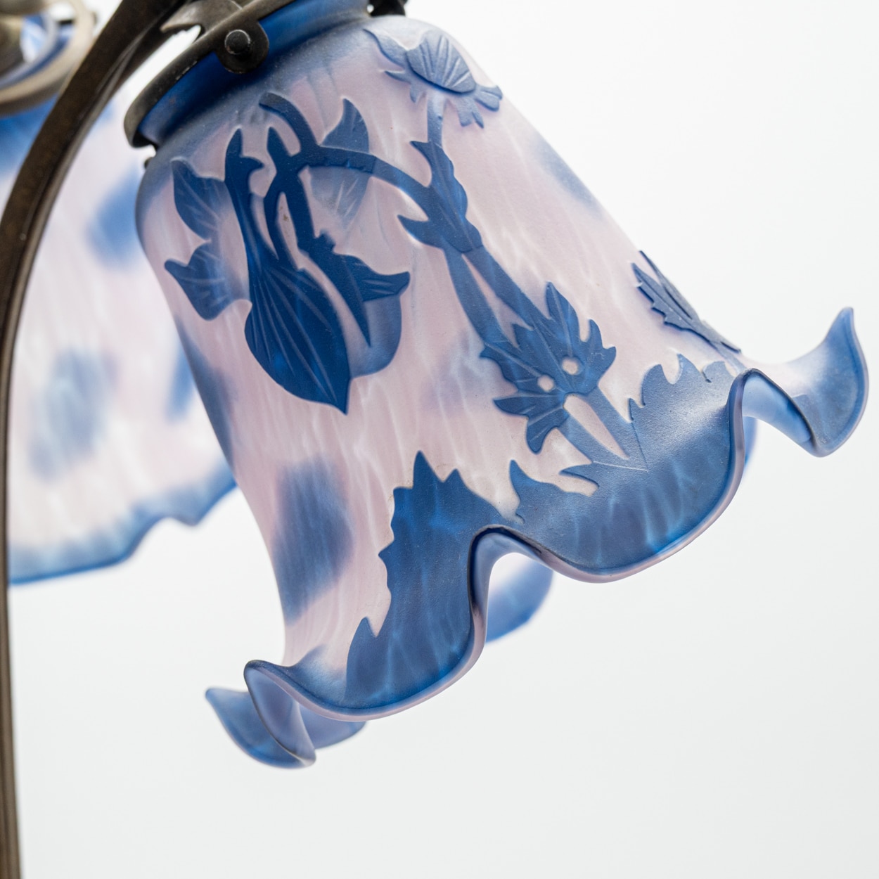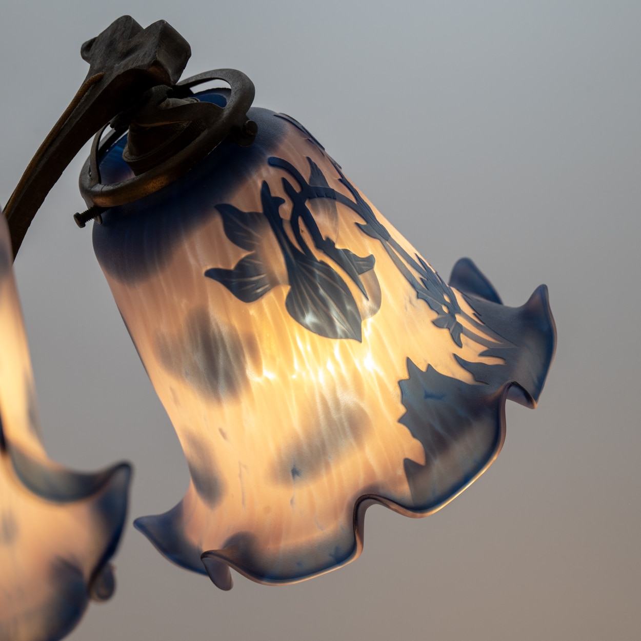 The lamp features a brass base and 3 arms with blue and clear glass shades with a floral pattern on it. Illuminates beautifully.