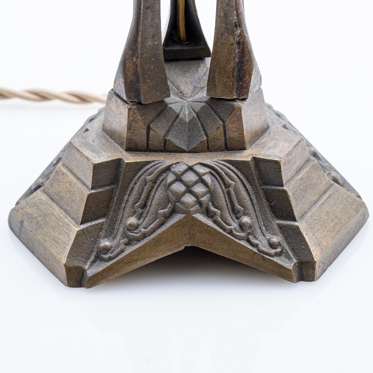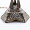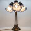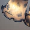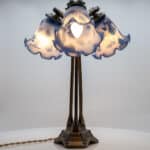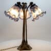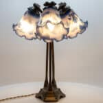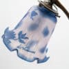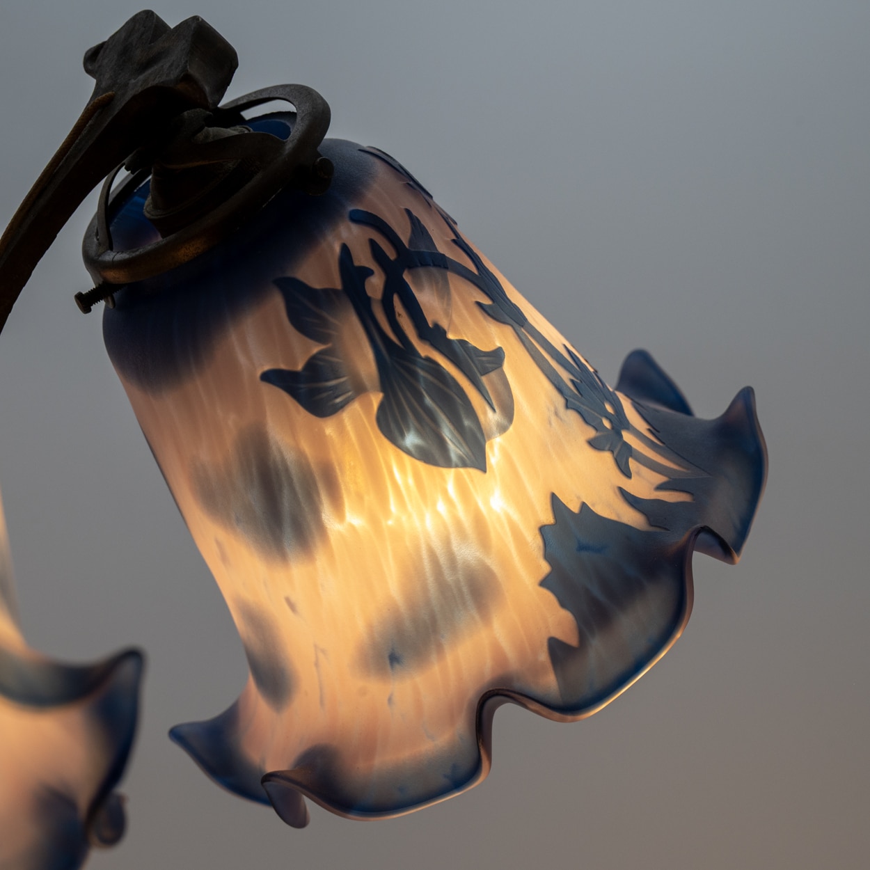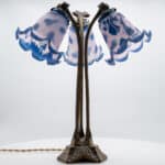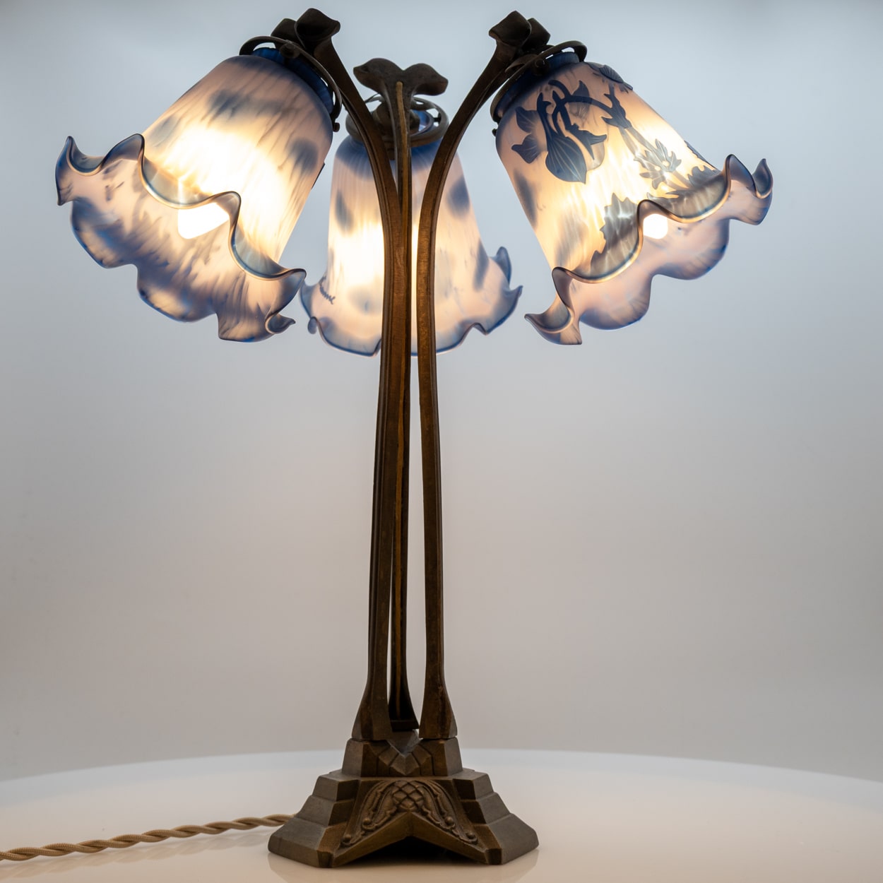 The lamp features a brass base and 3 arms with blue and clear glass shades with a floral pattern on it. Illuminates beautifully.