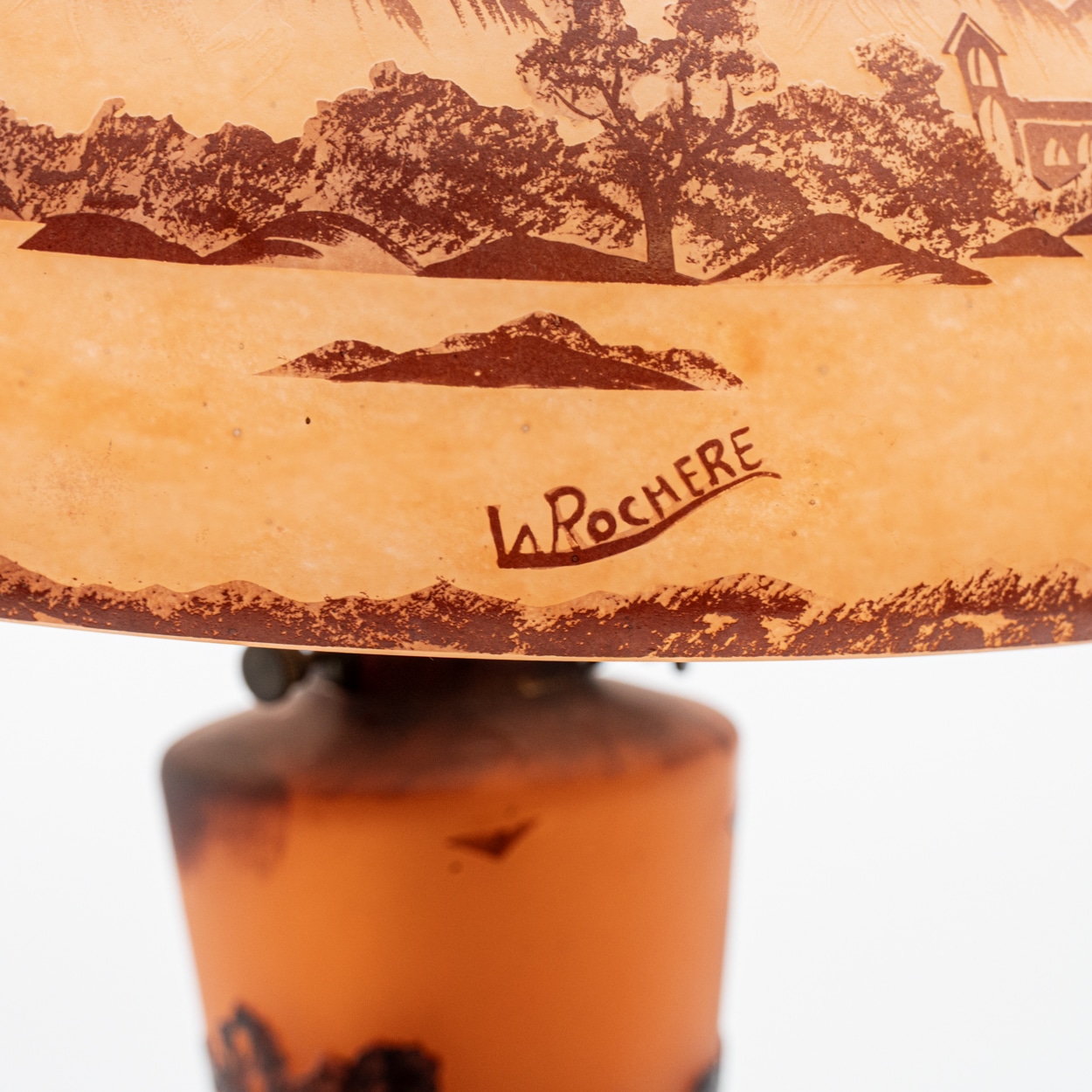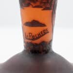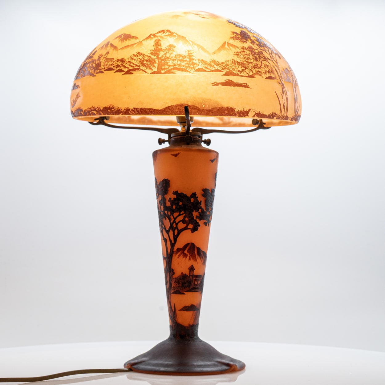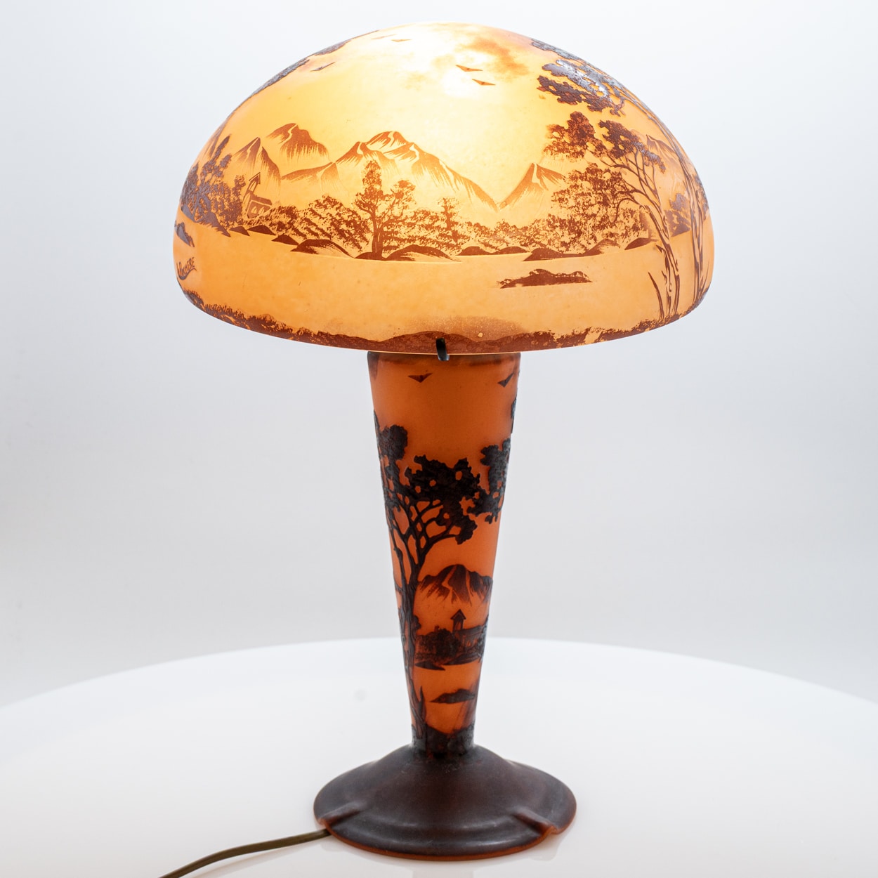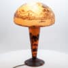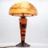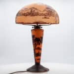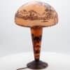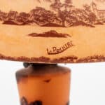 A La Rochère cameo glass lamp featuring a domed shade intricately carved with a bird perched among maple leaves and branches. The shade displays fine detailing and delicate color transitions characteristic of French cameo glass.