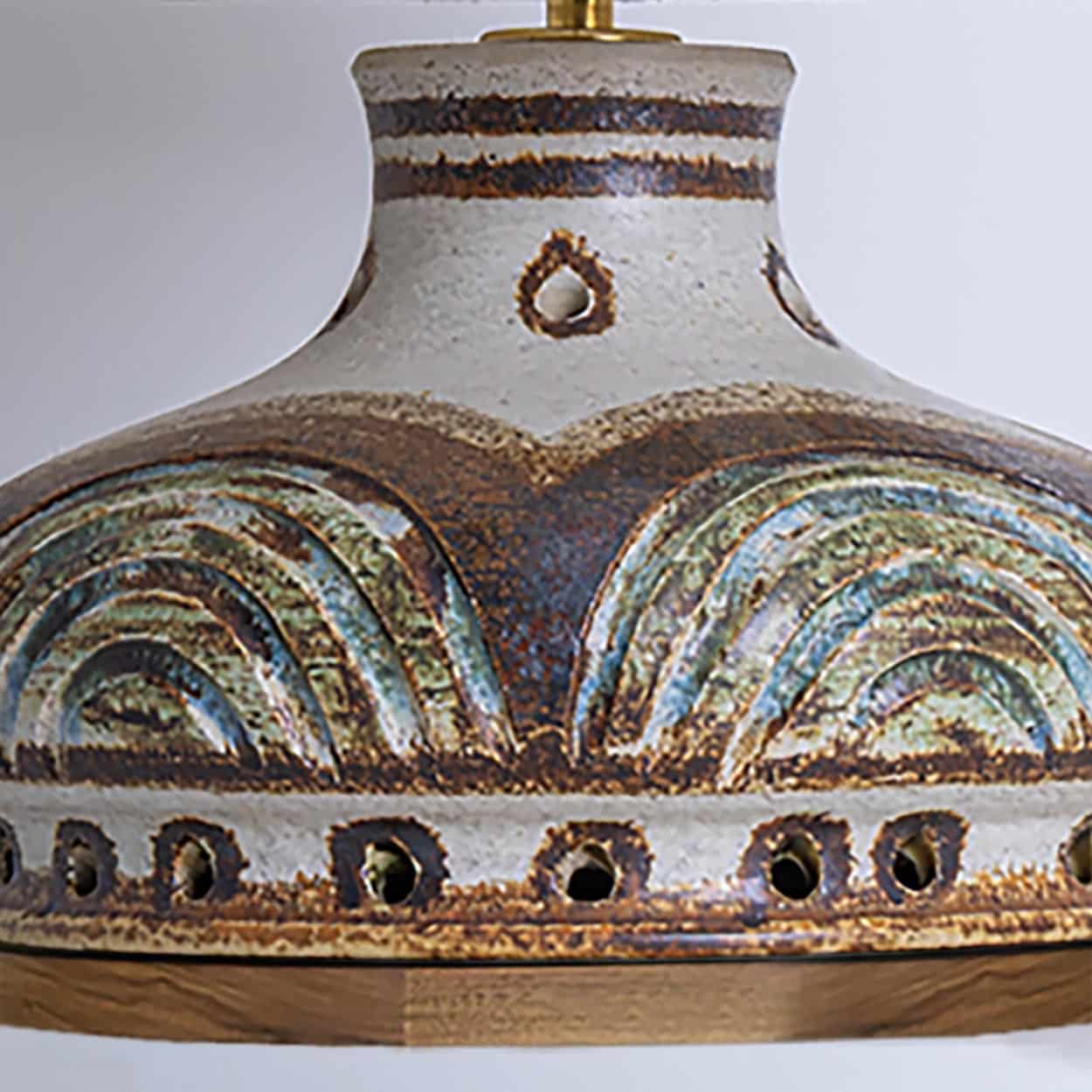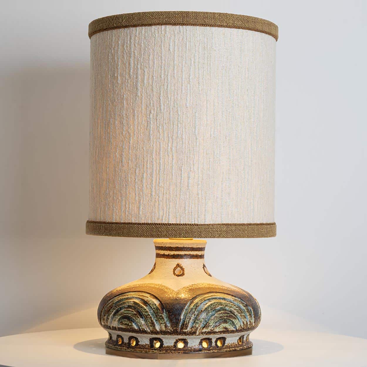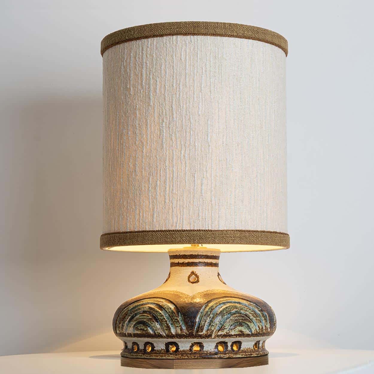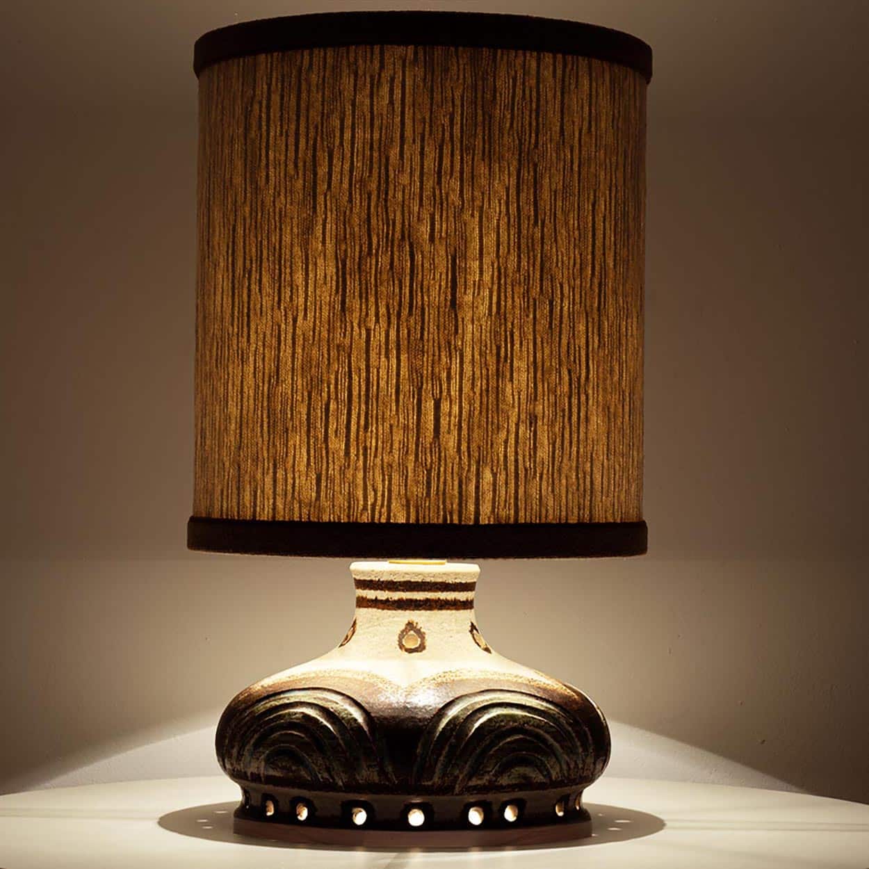This base used to be a pendant, but is now made to a new lamp base with custom shade by R. Houben in a neutral tone with ochre trimming. Illuminates through as well the shade as the base, creating a stunning combination.