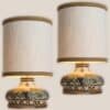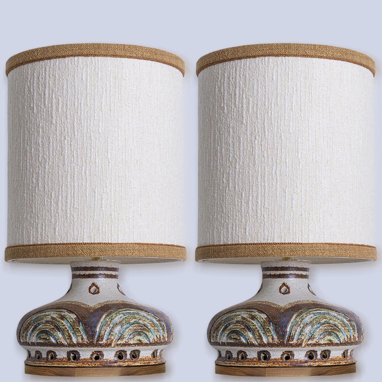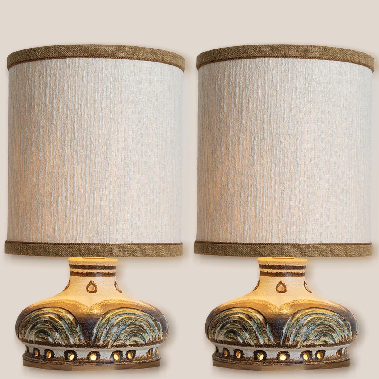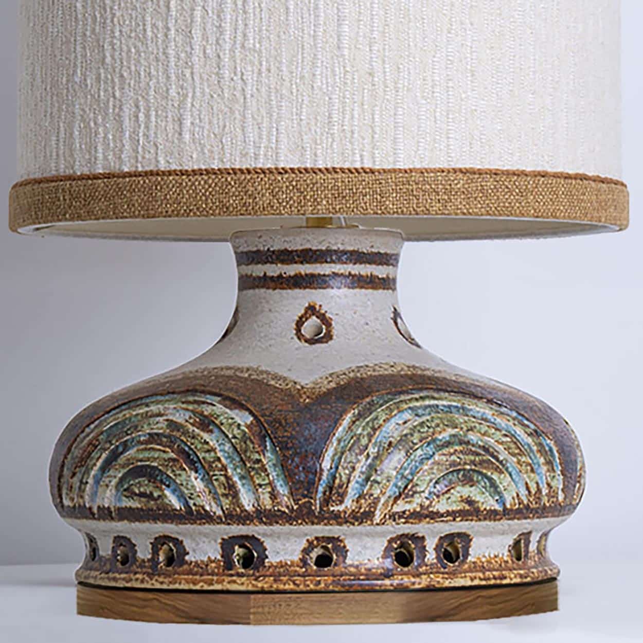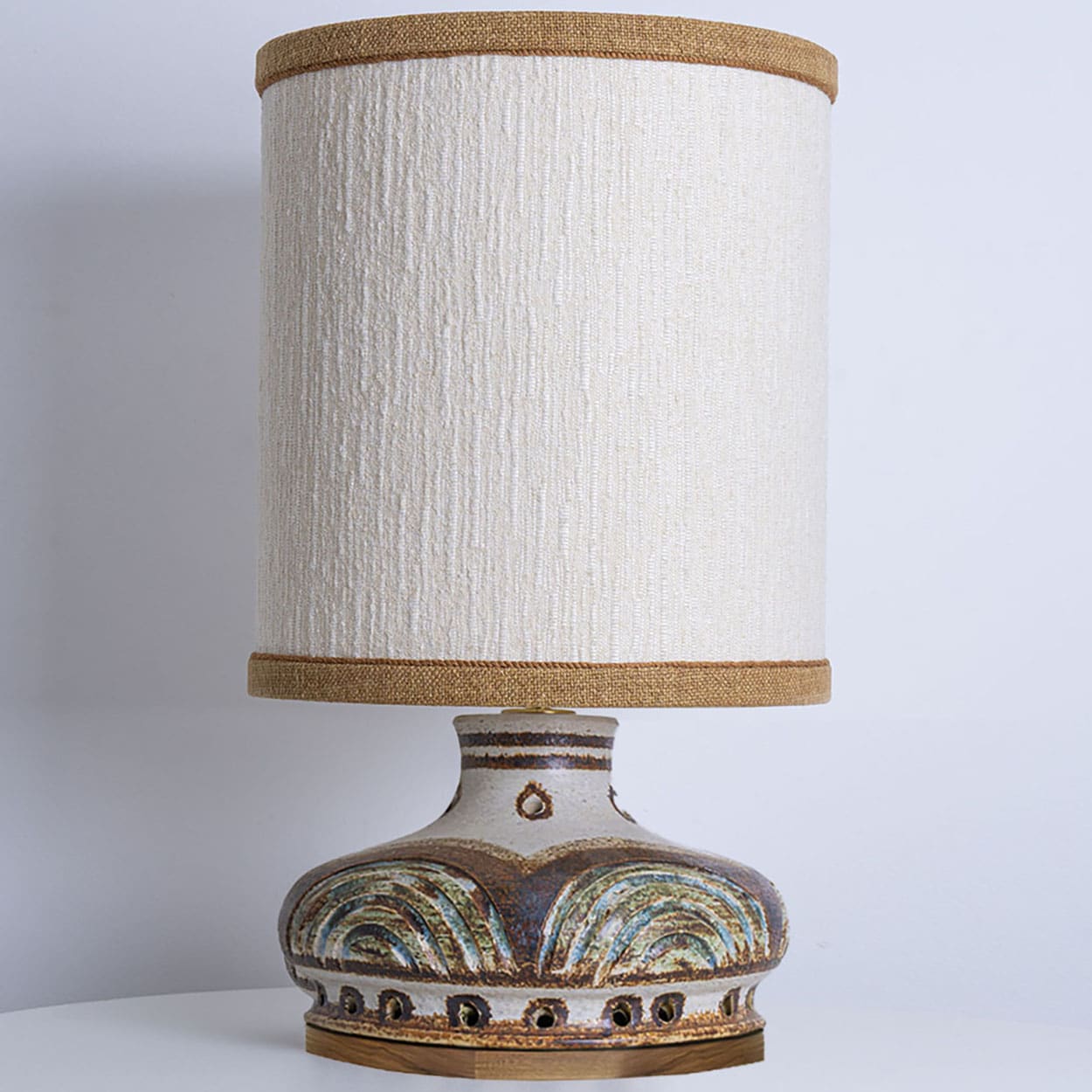 This base used to be a pendant, but is now made to a new lamp base with custom shade by R. Houben in a neutral tone with ochre trimming. Illuminates through as well the shade as the base, creating a stunning combination.