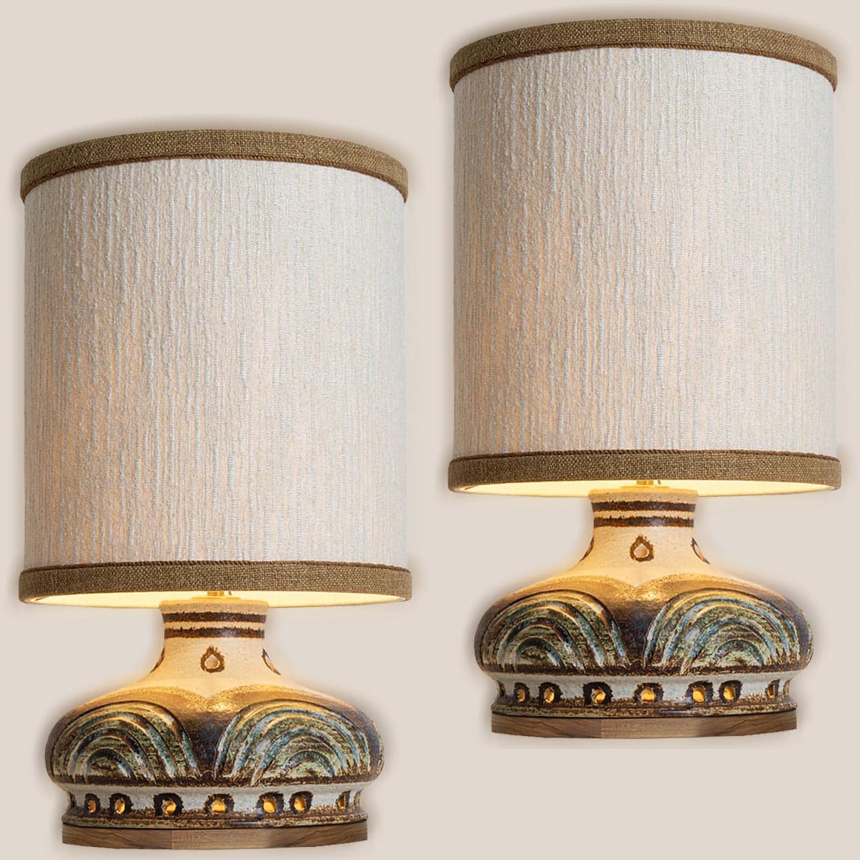 Labelled and signed by Axella, in excellent condition. Axella was found in the 70s in Denmark by Aksel Larsen, who later changed his name to Axella Keramik. The company, which produced impeccable, classic 1970’s style lamps, closed in 1987. The designer Jette Hellerøe worked for a short period in collaboration with Axella.
