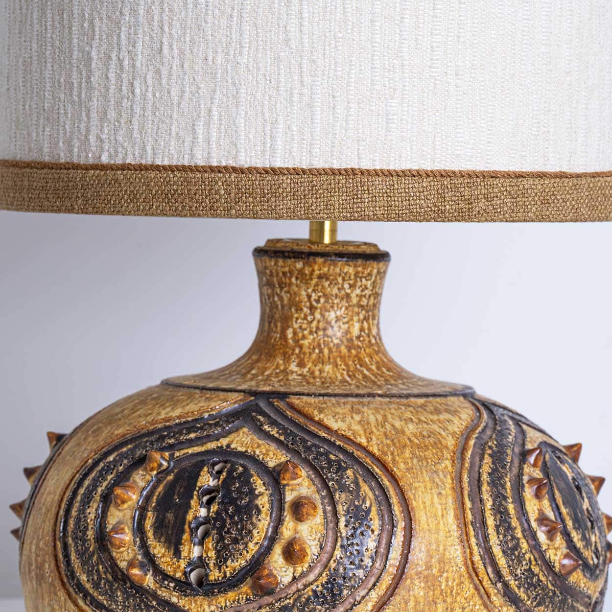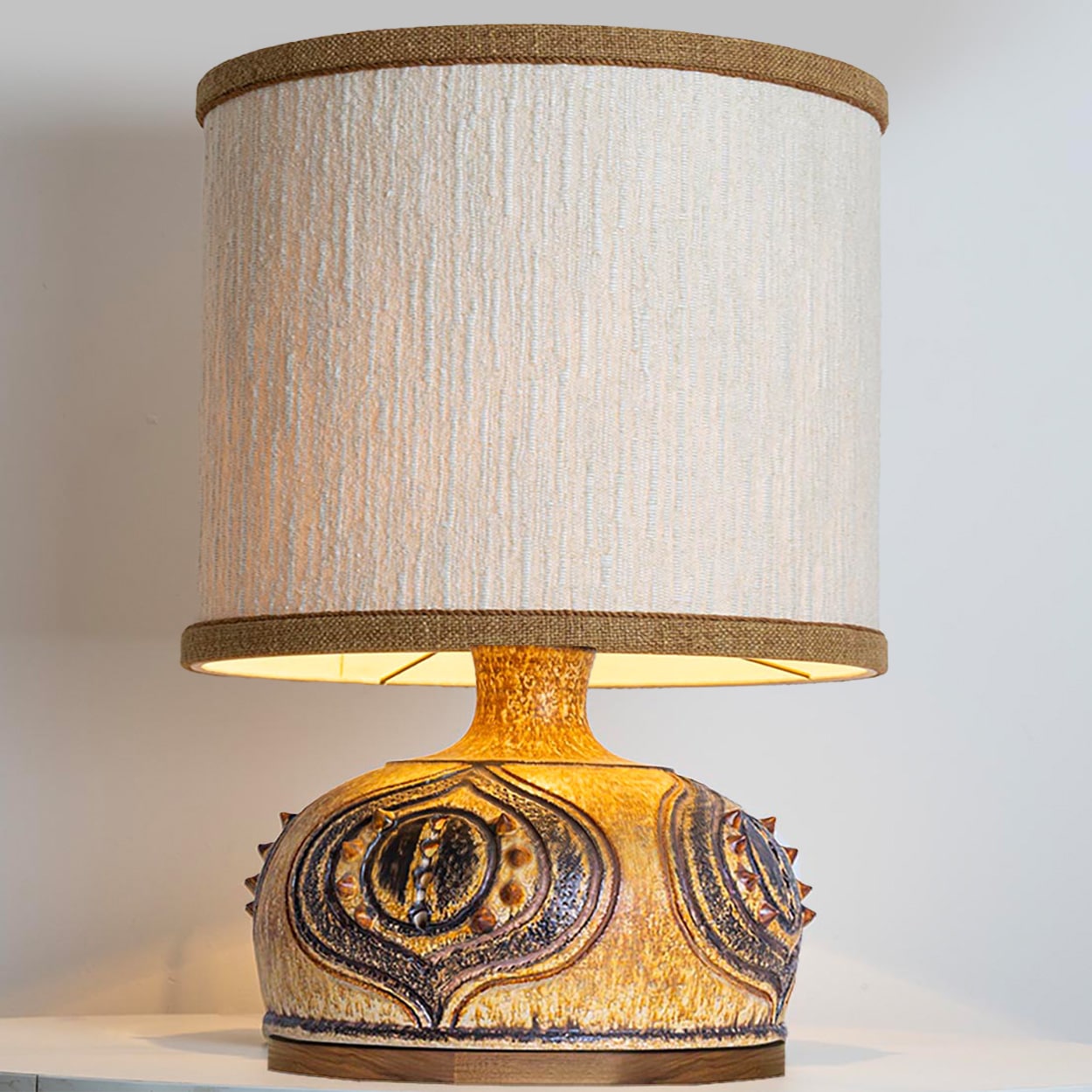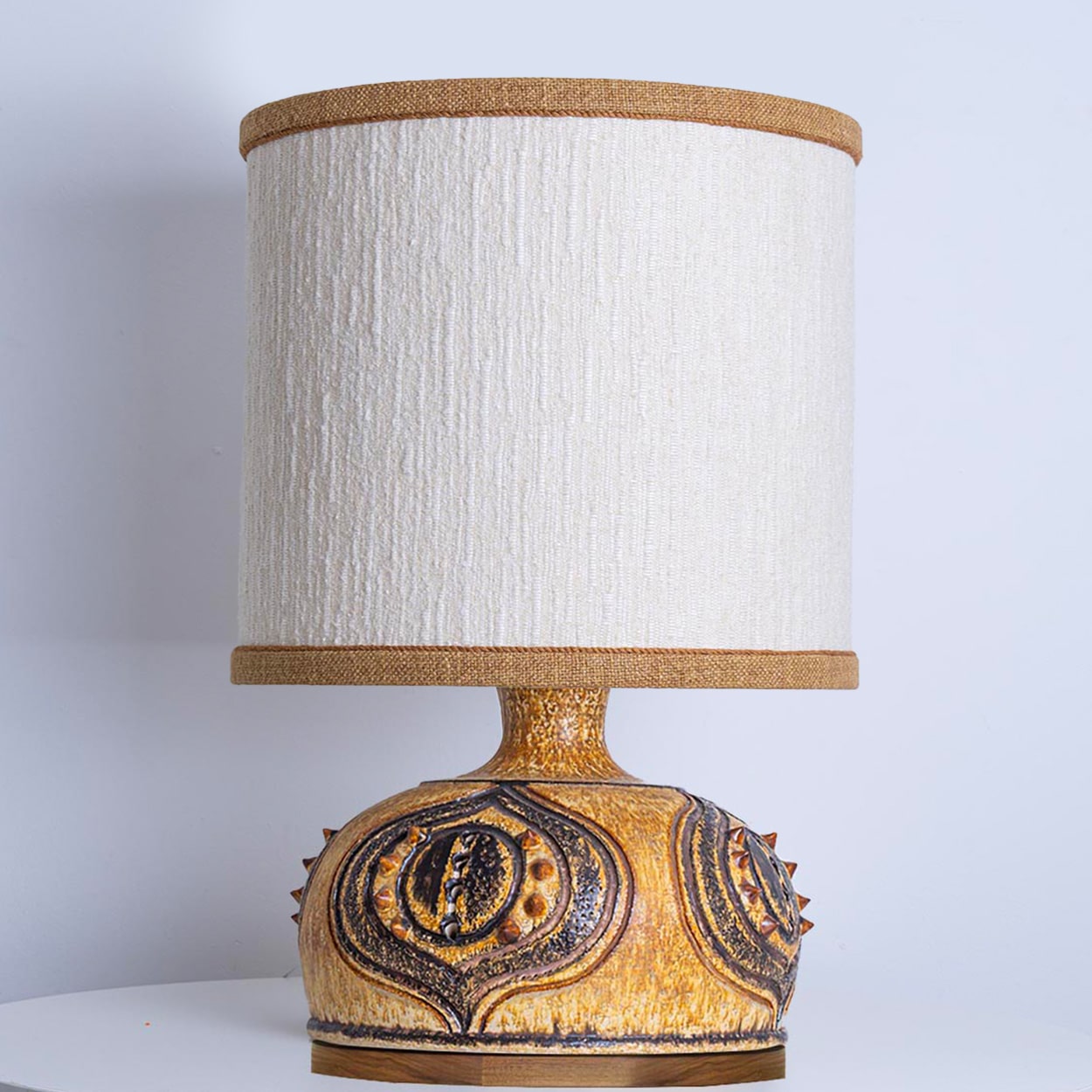 Stunning table lamp with yellow, brown and cognac ceramics by Axella, manufactured in the 1970s in Denmark. Combined with a new custom made lampshade by R. Houben.