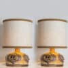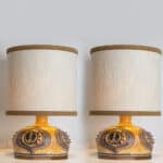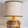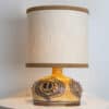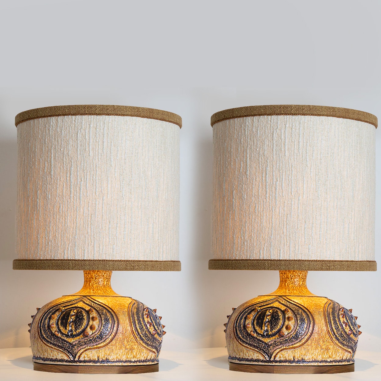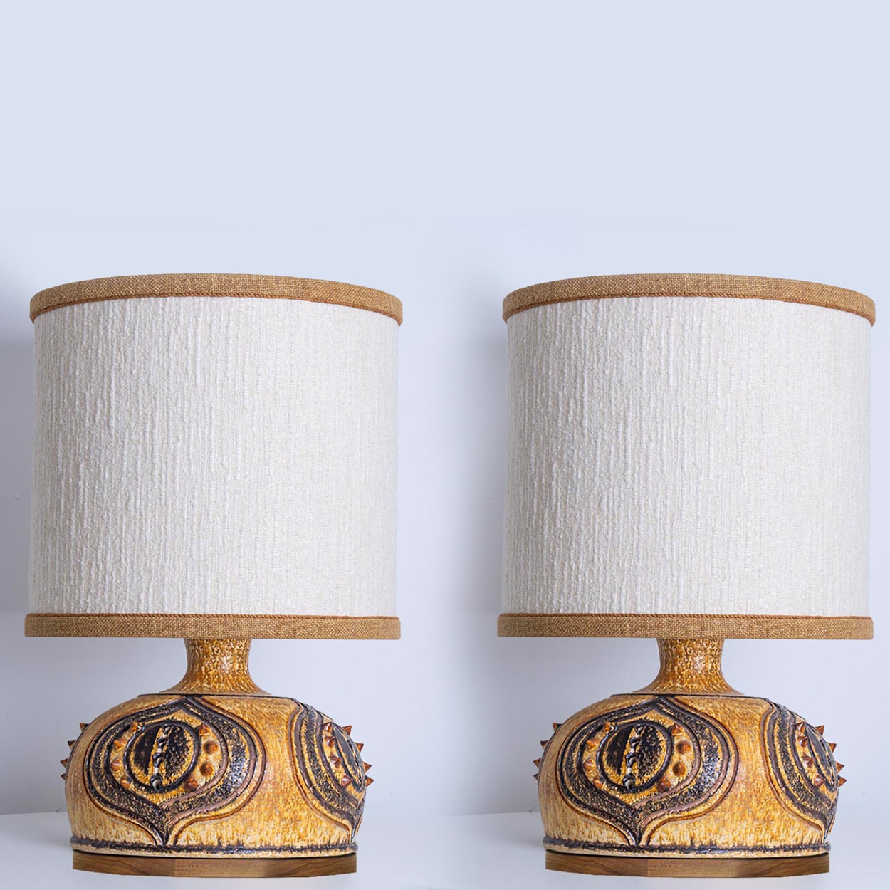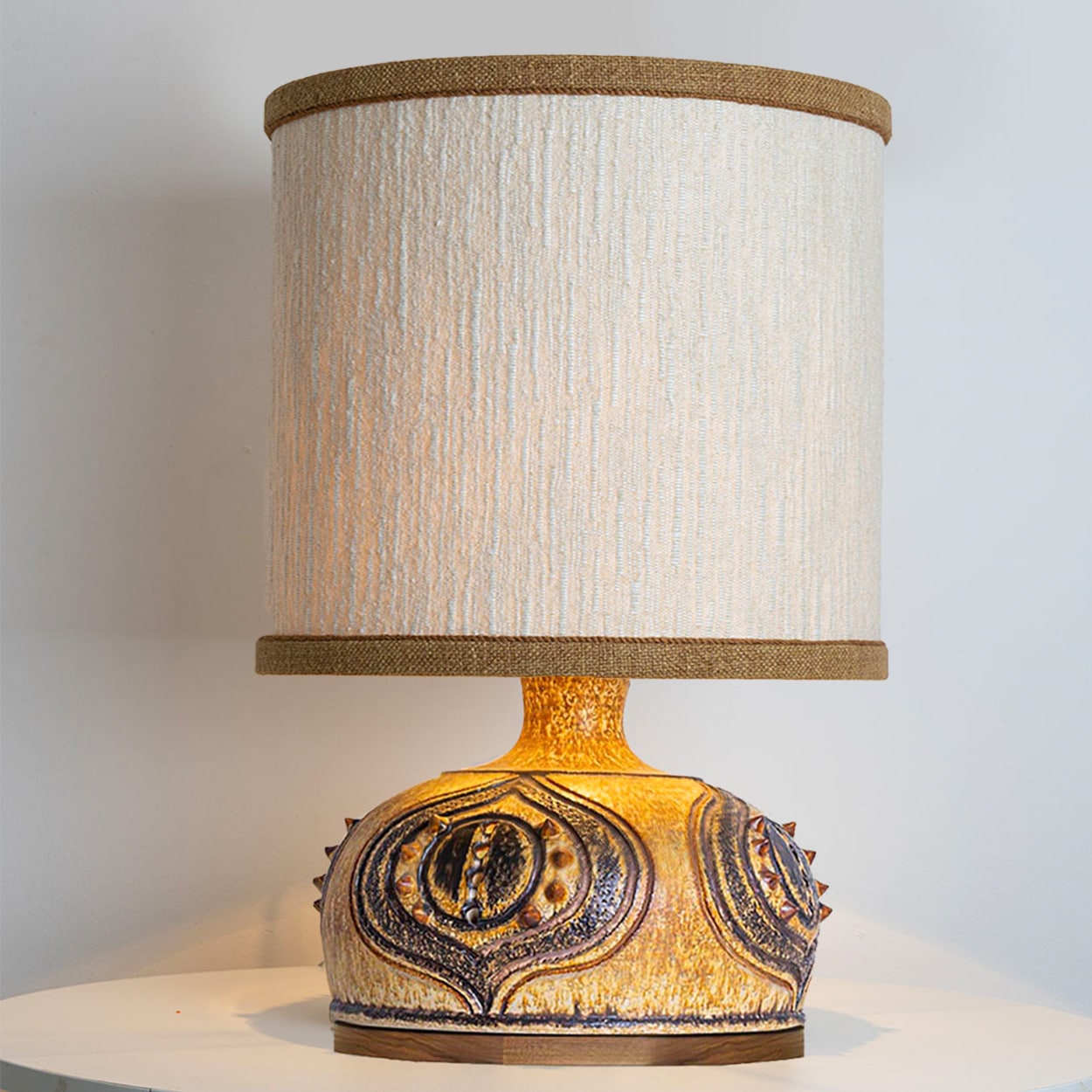 Stunning table lamp with yellow, brown and cognac ceramics by Axella, manufactured in the 1970s in Denmark. Combined with a new custom made lampshade by R. Houben.