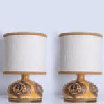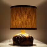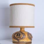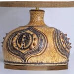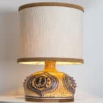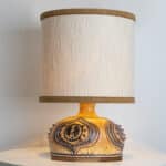 This base used to be a pendant, but is now made to a new lamp base with custom shade by R. Houben in a neutral tone with ochre trimming. Illuminates through aswell the shade as the base, creating a stunning combination.