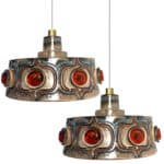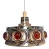 1 of the 3 stunning round hanging lamp with an unusual shape, made with rich colored blue,beige and brown ceramic, with terracotta/warm orange glass details, manufactured in the 1970s in Denmark.