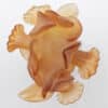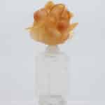The bottle – made out of art glass – is made from a clear glass, with a orange colored glass flower on top. Beautiful artwork.