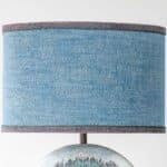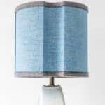 This base with glazed blue teal ceramic fits perfectly with the custom made lamp shade. A beautiful combination and a real eye catcher.