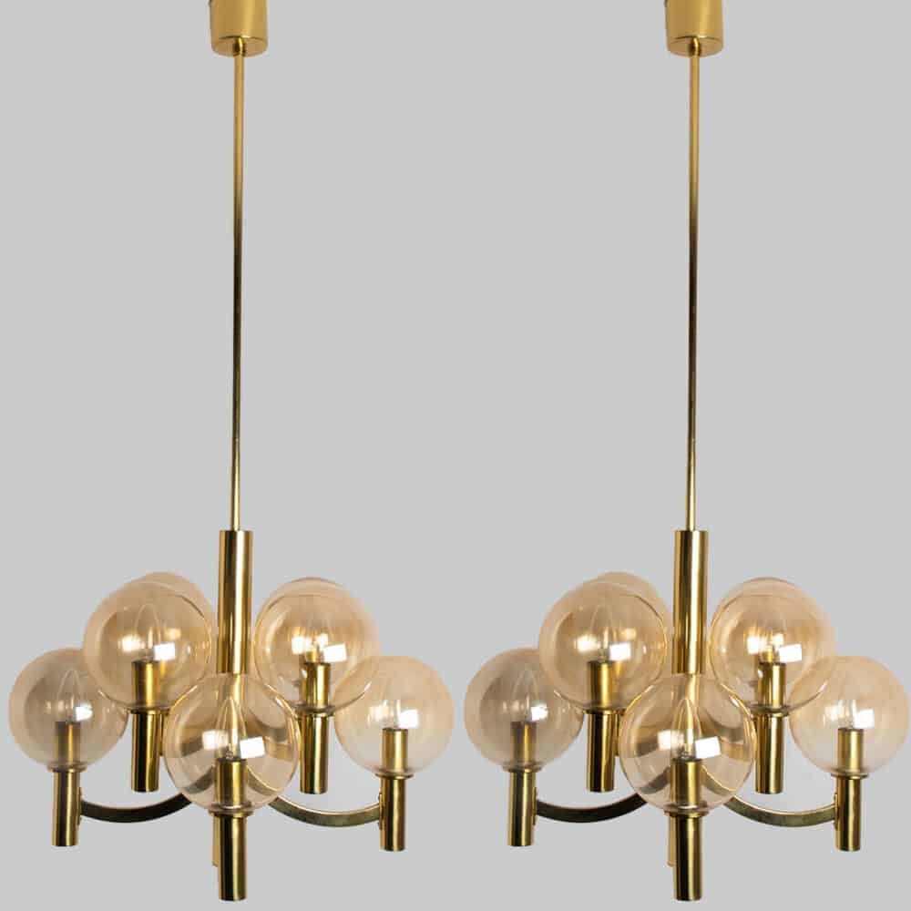 Cleaned and well-wired, in full working order and ready to use. The brass frame is in very good condition. The wall lights can be disassembled and the glass individually wrapped for easy transport. The fixture requires 8 E14 standard bulb. Also LED compatible.