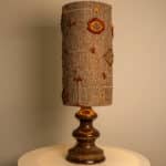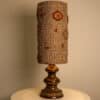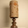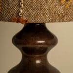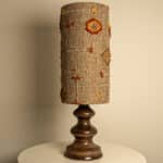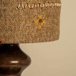 This beautiful shaped base with brown tones fits perfectly with the custom made shade with beautiful embroidery in earth tones. Illuminates beautifully.