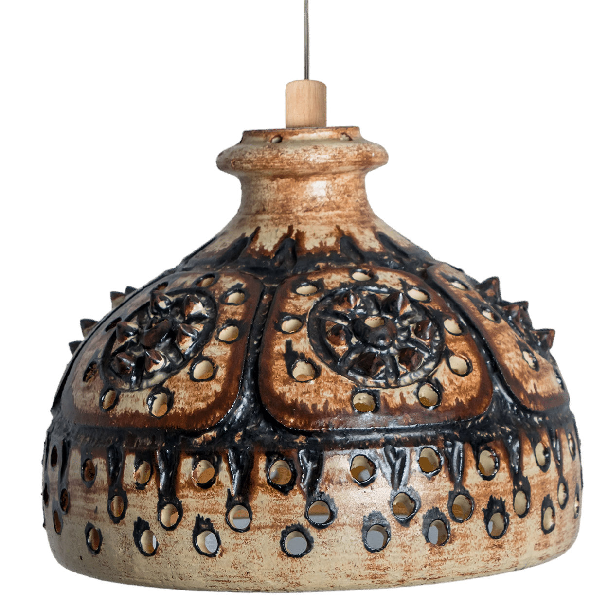 Stunning round hanging lamp with an cone-like shape, made with rich chocolate colored brown ceramics, manufactured in the 1970s in Denmark. We also have a multitude of unique colored ceramic light sets and arrangements, all available in the frontstore.  Different playful arrangements available. All the lights are handmade by dedicated designers from Denmark and Sweden.