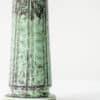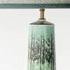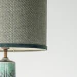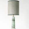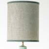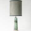 This conical base with glazed green and brown ceramic fits perfectly with the custom made neutral silk lamp shade with seagreen trimming. A beautiful combination and a real eye catcher.