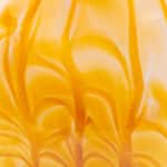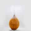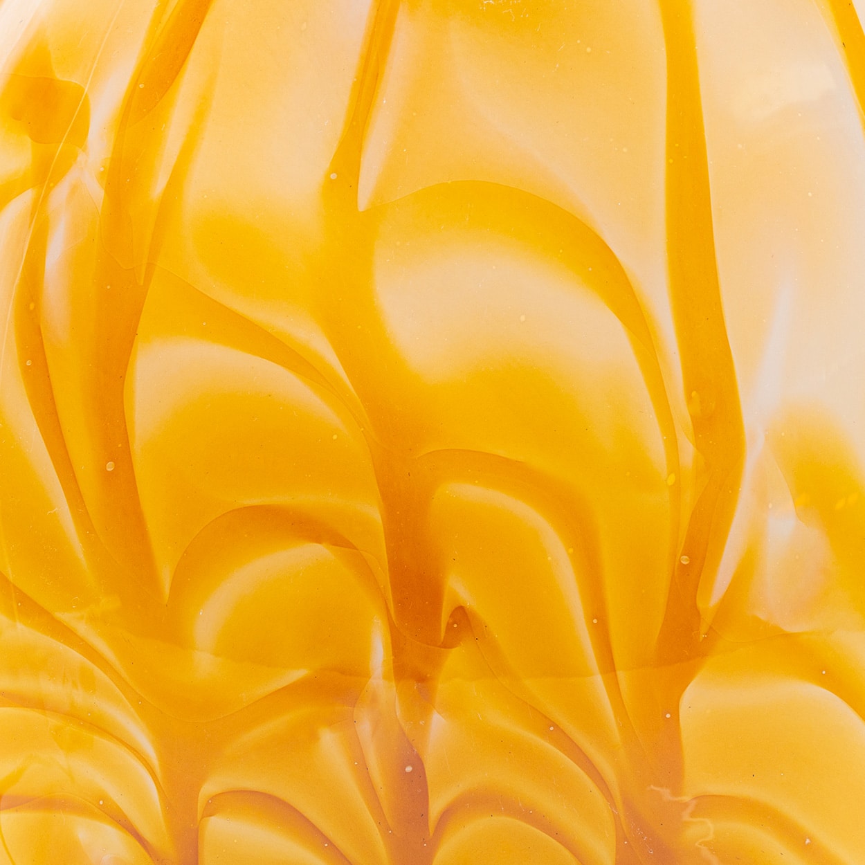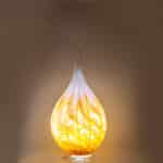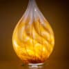 The teardrop-shaped body features swirling orange and yellow tones that glow beautifully when illuminated, creating a warm, ambient light.