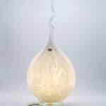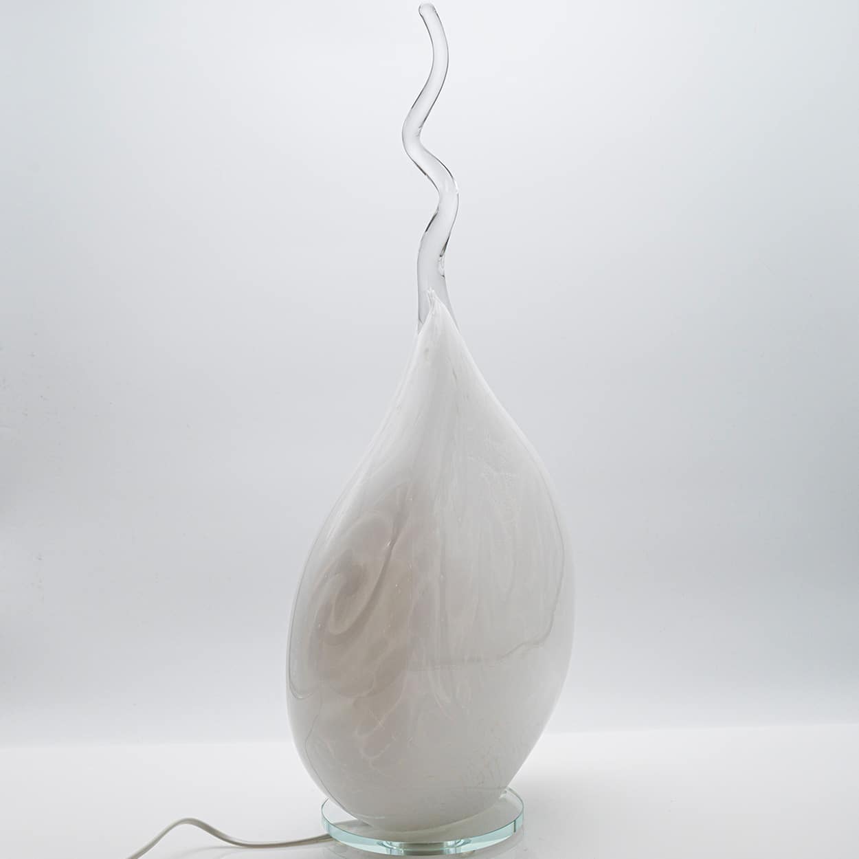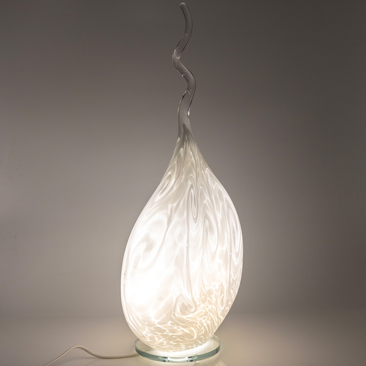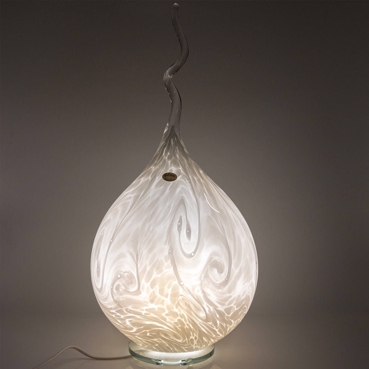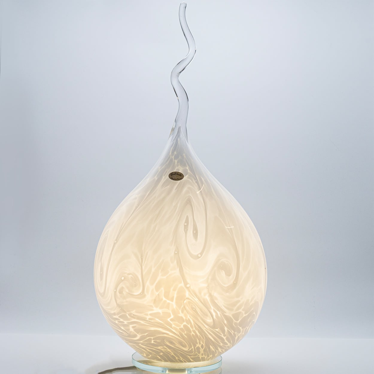 The teardrop-shaped body features swirling white glass that glow beautifully when illuminated, creating a beautiful light.