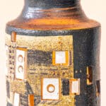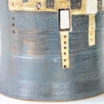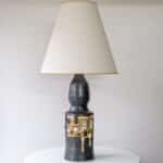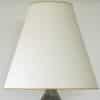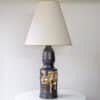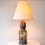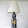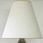 The dark ceramics and the warm colored geometric details fit perfectly with the custom made tapered silk shade with brown trimming.