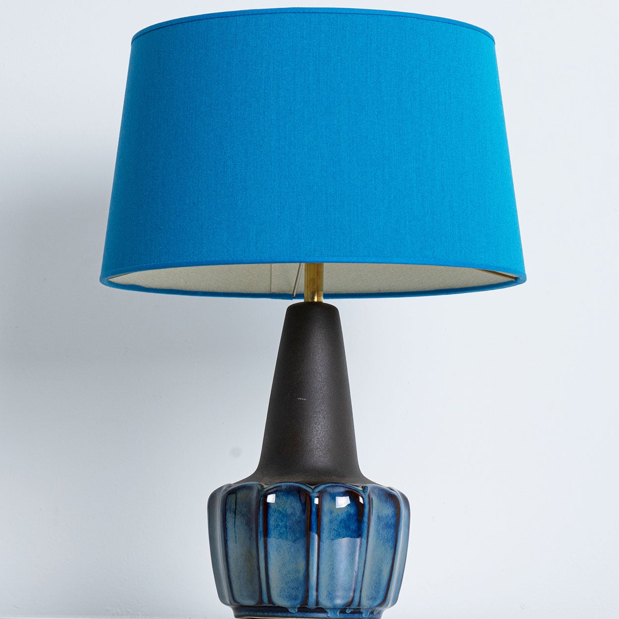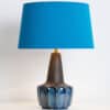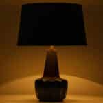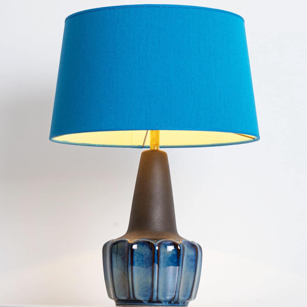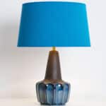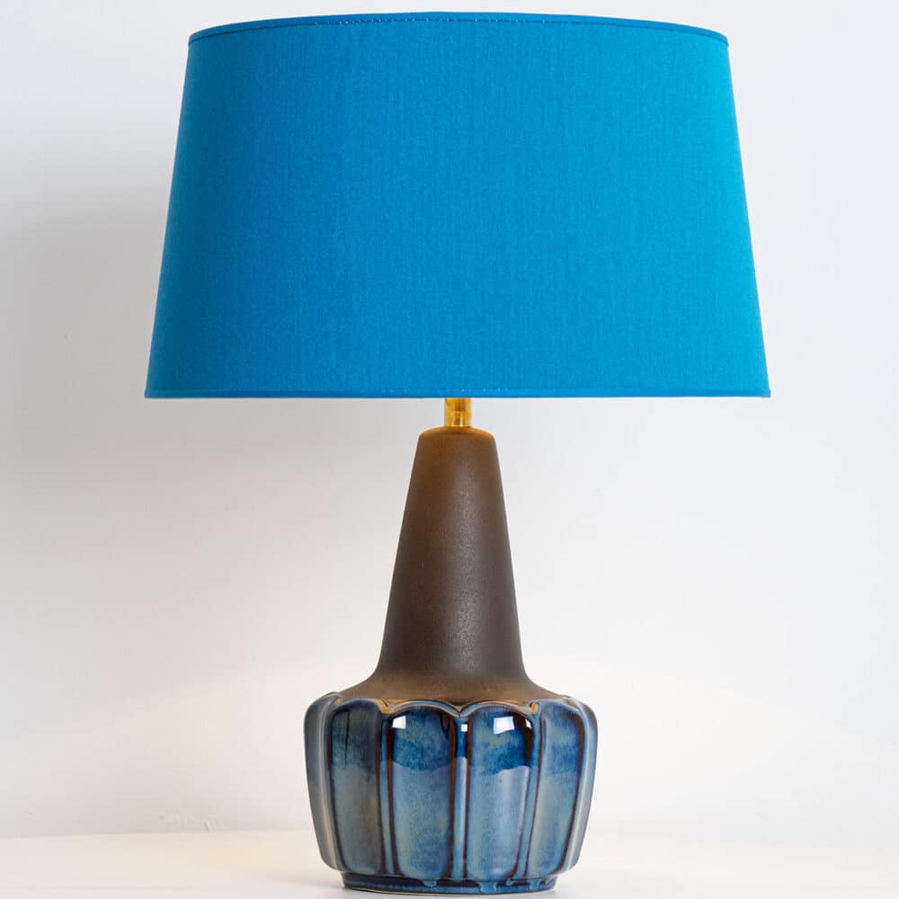 Ceramic table lamp by Soholm, Denmark, 1960s. This high-end sculptural piece is handmade ceramic in blue and brown tones, with a combination of dry and glazed finishes. With a new custom made blue silk lamp shade with beige inner-shade by René Houben.
