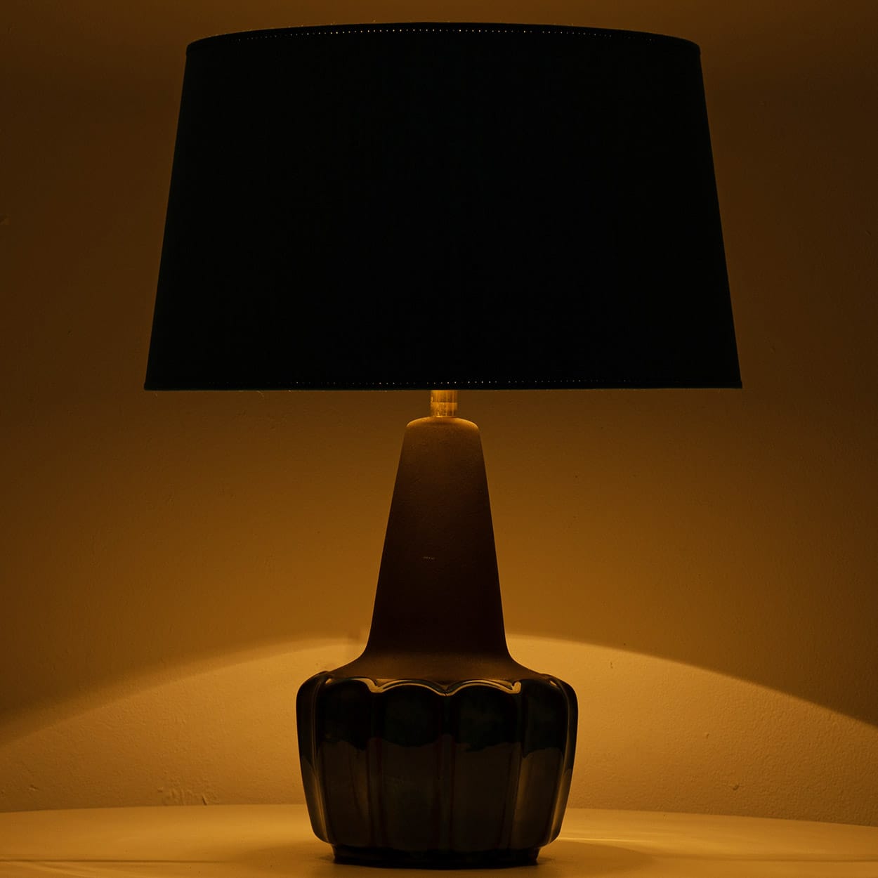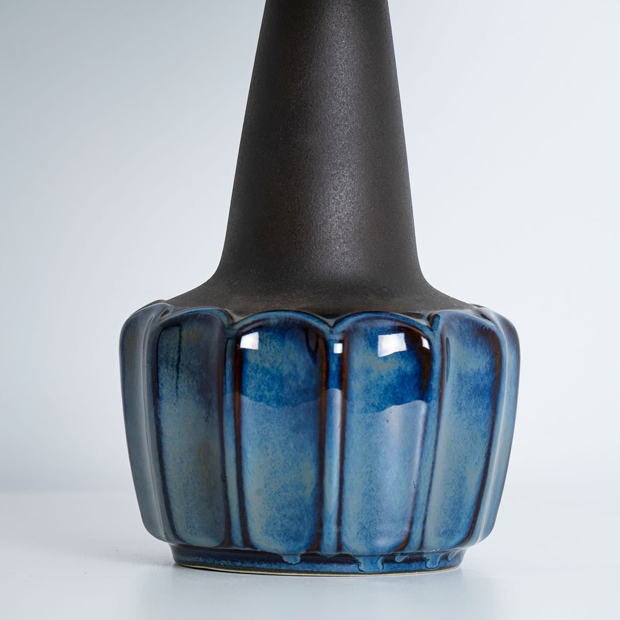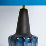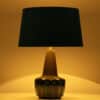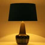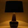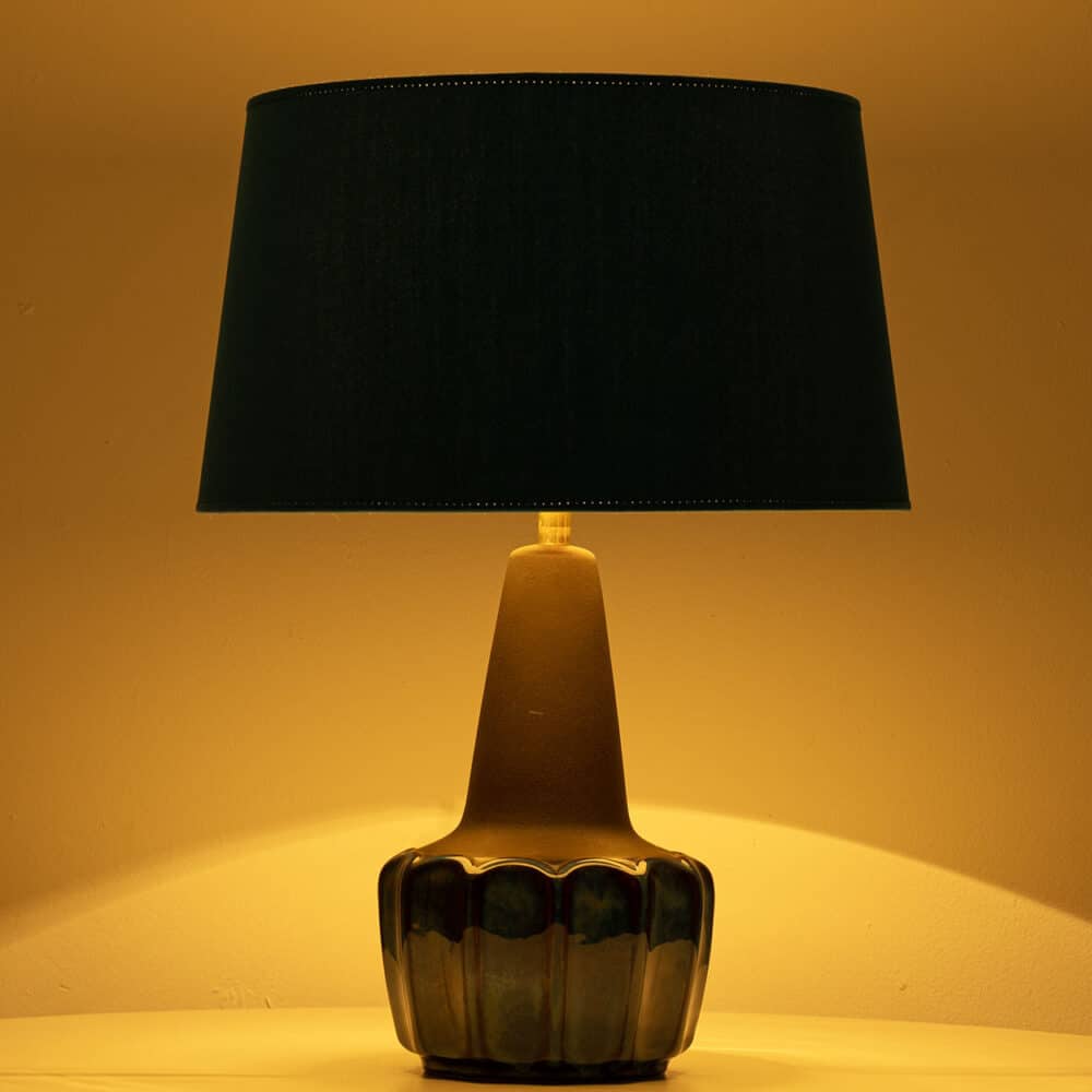 Ceramic table lamp by Soholm, Denmark, 1960s. This high-end sculptural piece is handmade ceramic in blue and brown tones, with a combination of dry and glazed finishes. With a new custom made blue silk lamp shade with beige inner-shade by René Houben.