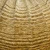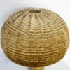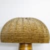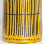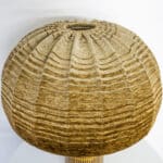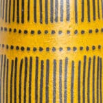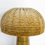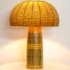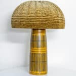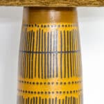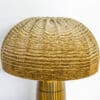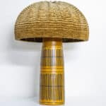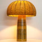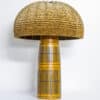 The brown and yellow colored ceramics and the details of stripes and lines fit perfectly with the custom made mushroom round lampshade.