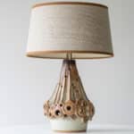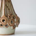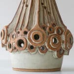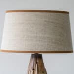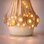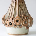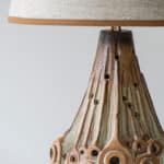 This brutalist style base with brown tones and various holes which illuminate fits perfectly with the custom made neutral silk shade with brown trimming by R. Houben.