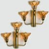 This flower like wall sconce is made of brass with glass flowers and are from Germany. The sconce shows three amber glass flowers, each contains one light bulb.