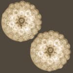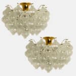One of the two exceptional ‘Tulipan’ flush mount chandeliers by J.T. Kalmar, Austria, Vienna. Manufactured in the midcentury, circa 1960 (late 1960s-early 1970s). With beautiful Murano Tulipan shaped hand blown bubble glasses. Several glasses are mounted with brass bolts on a white enameled metal frame.