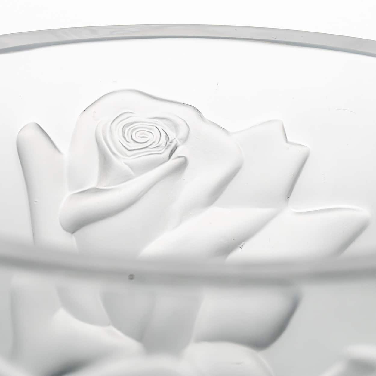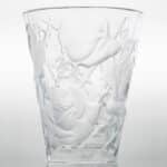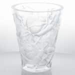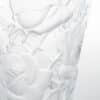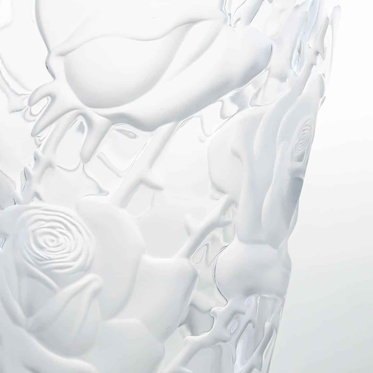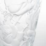 The vase’s design combines clear and frosted crystal, creating a captivating contrast that enhances the depth and texture of the floral motifs. Every detail reflects Lalique’s signature craftsmanship and timeless artistry.