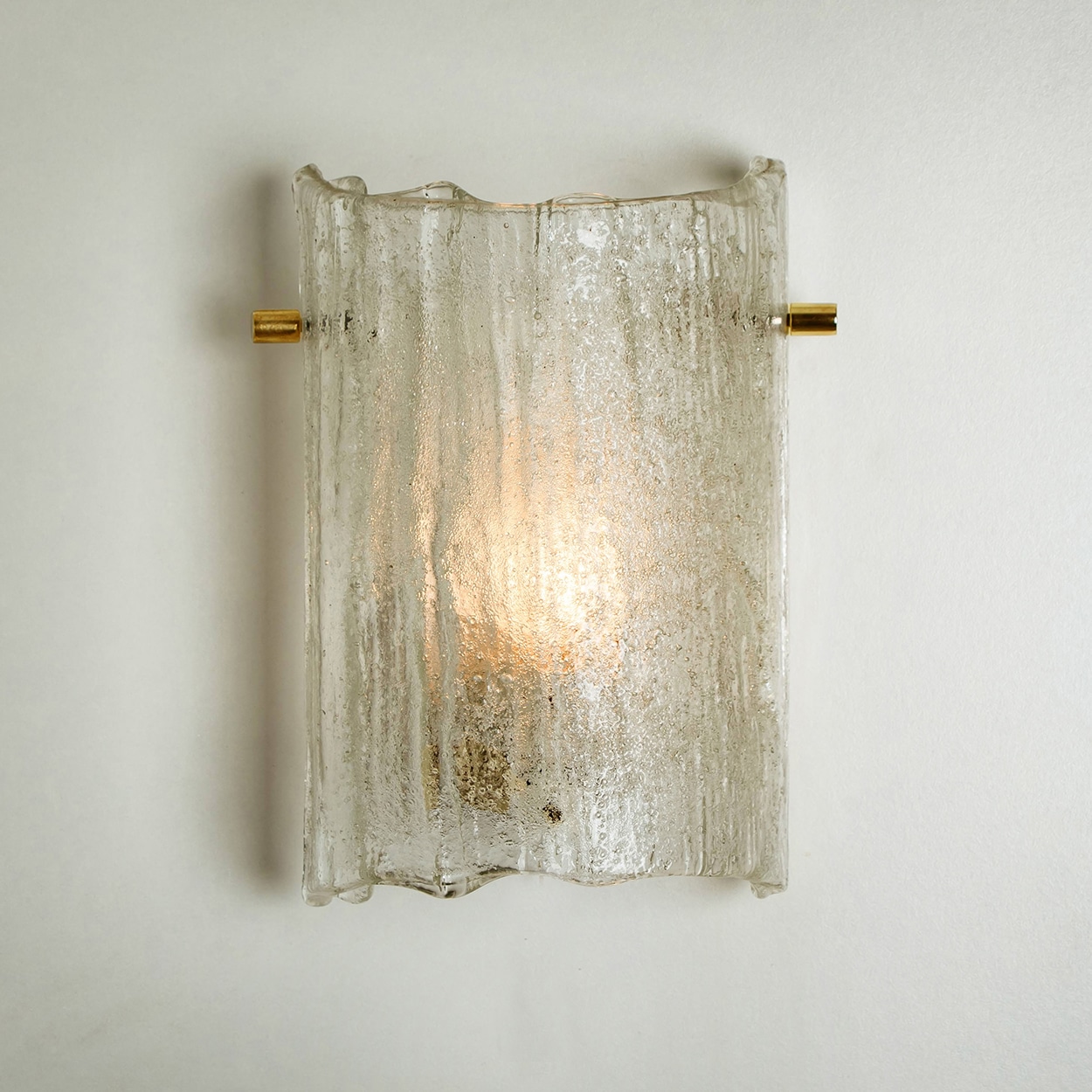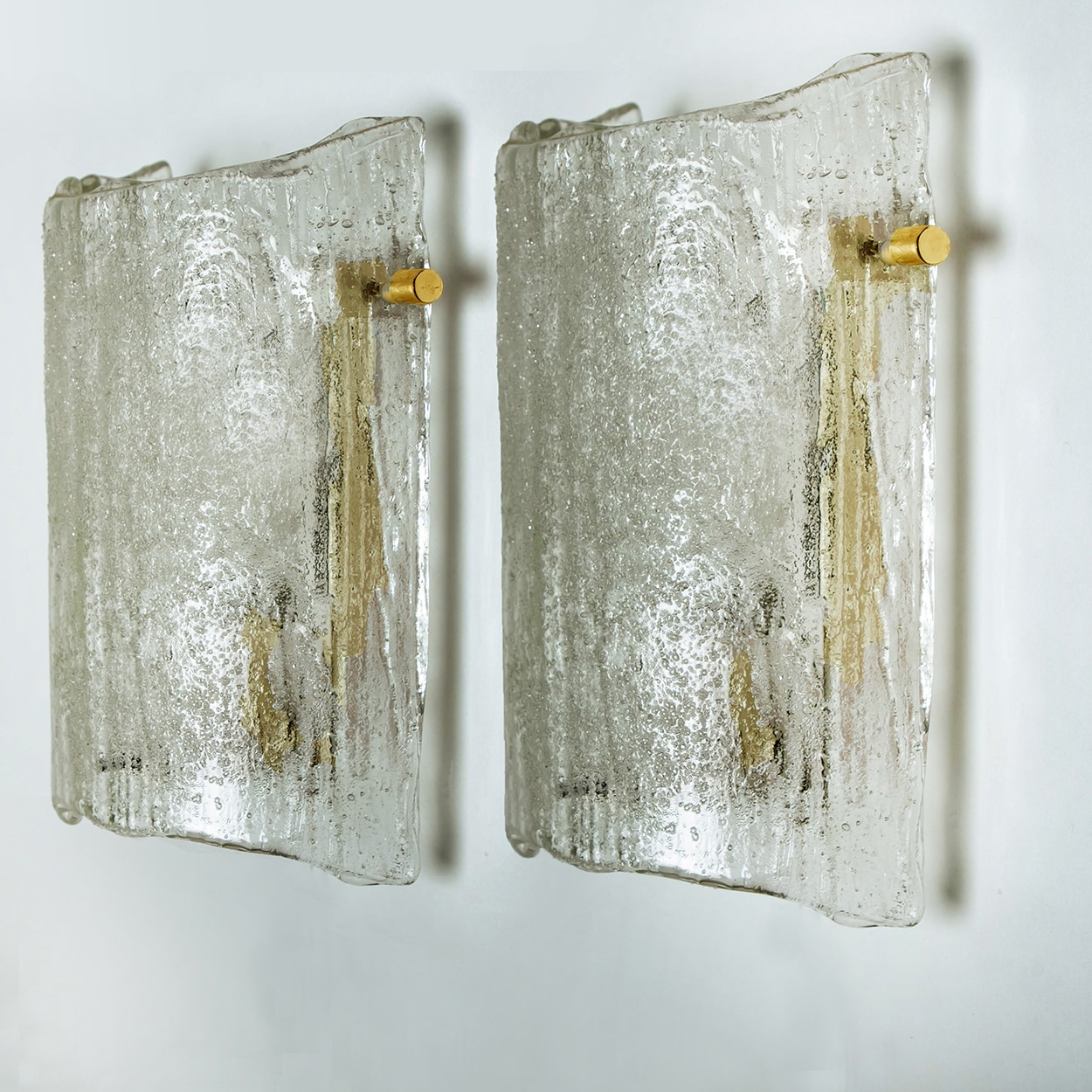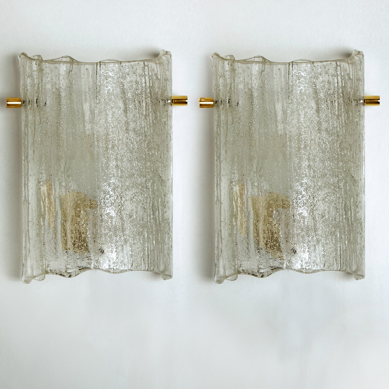 Pair of  high-end wall sconces made of blown glass on a brass hardware. Designed and produced by J.T. Kalmar, Austria in the 1960s. Minimalistic design executed with a taste for excellence in craftsmanship. These are real statement pieces.