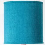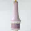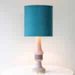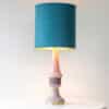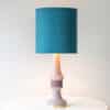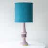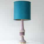 This lamp features a beautifully shaped ceramic base in a lilac color, finished with a brass standard. Combined with a beautiful deep teal colored silk shade, custom made.