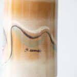 This rare base with ceramic, wood and metal fits perfectly with the custom made silk shade by R. Houben with brown trimming.