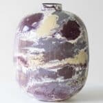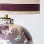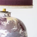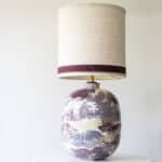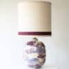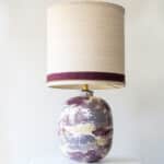 This decorative base by Paul Schneider with burgundy, purple, cream and white tones fits perfectly with the custom made silk shade with trimming in matching color.